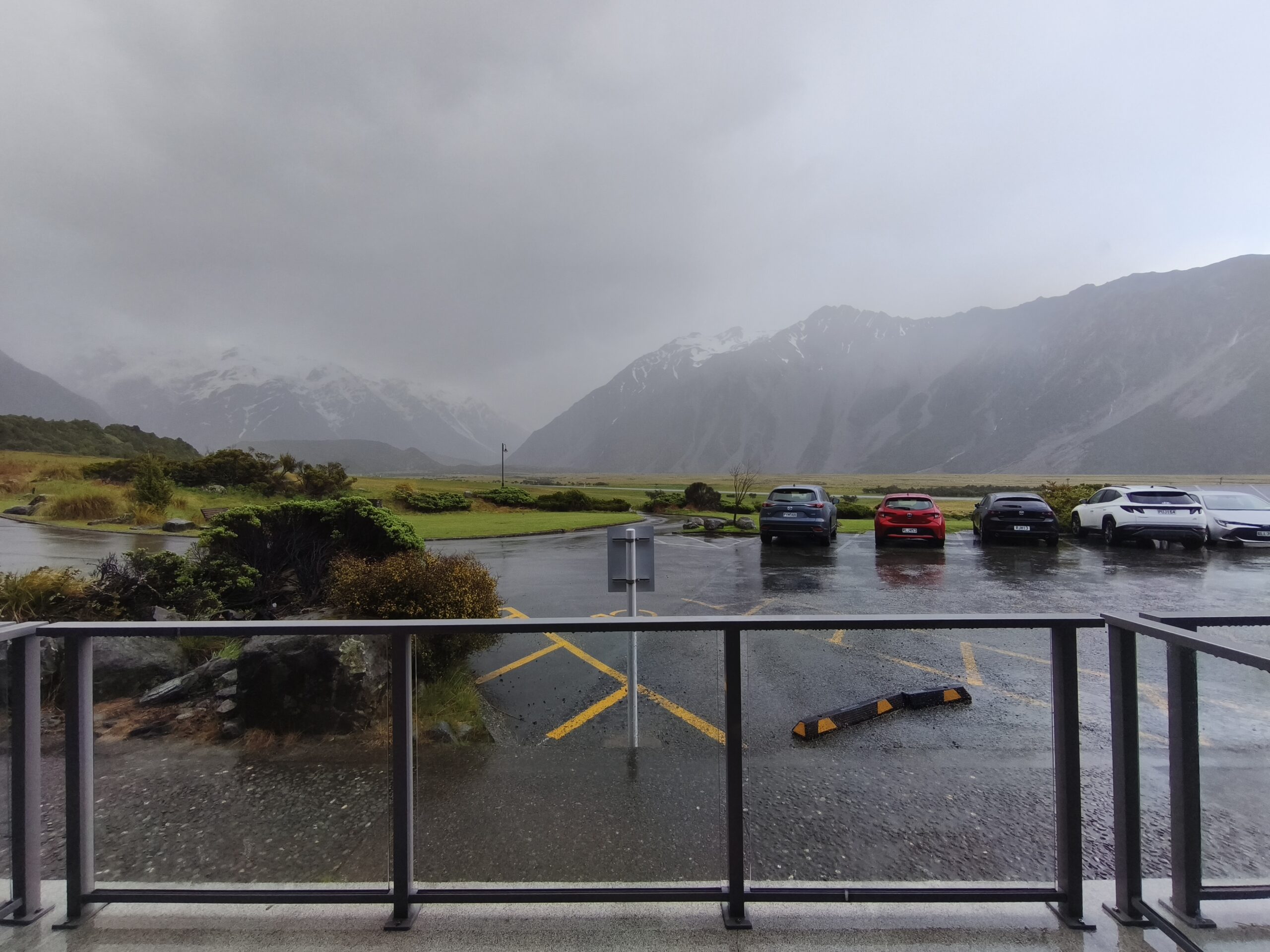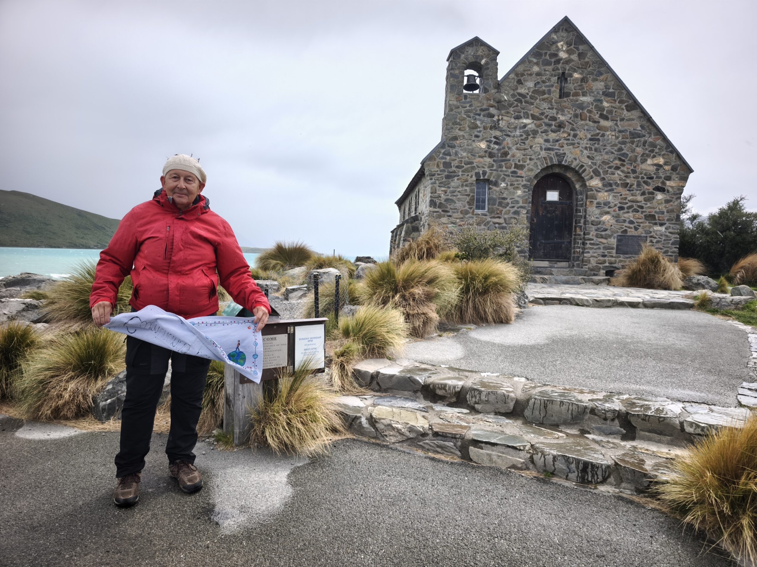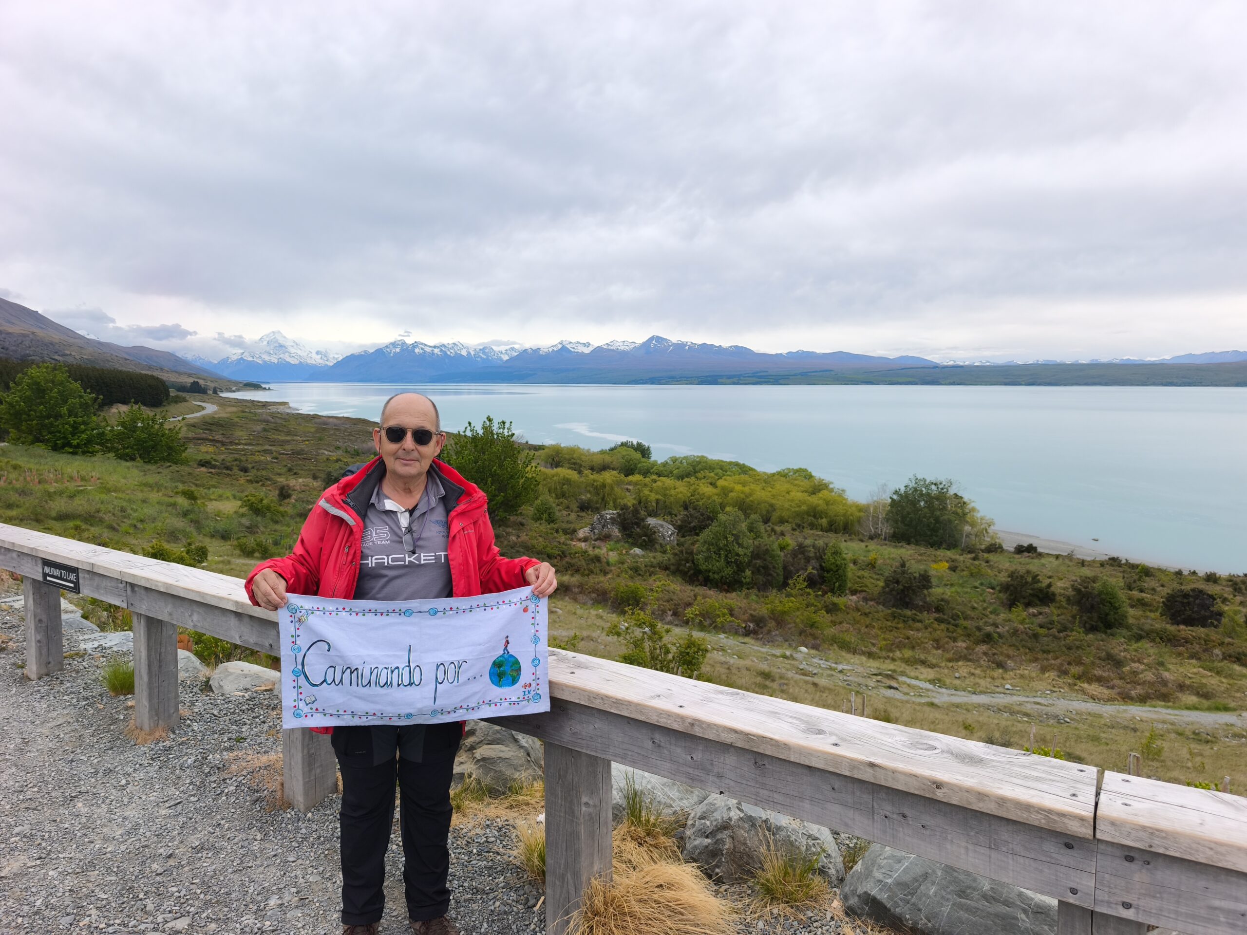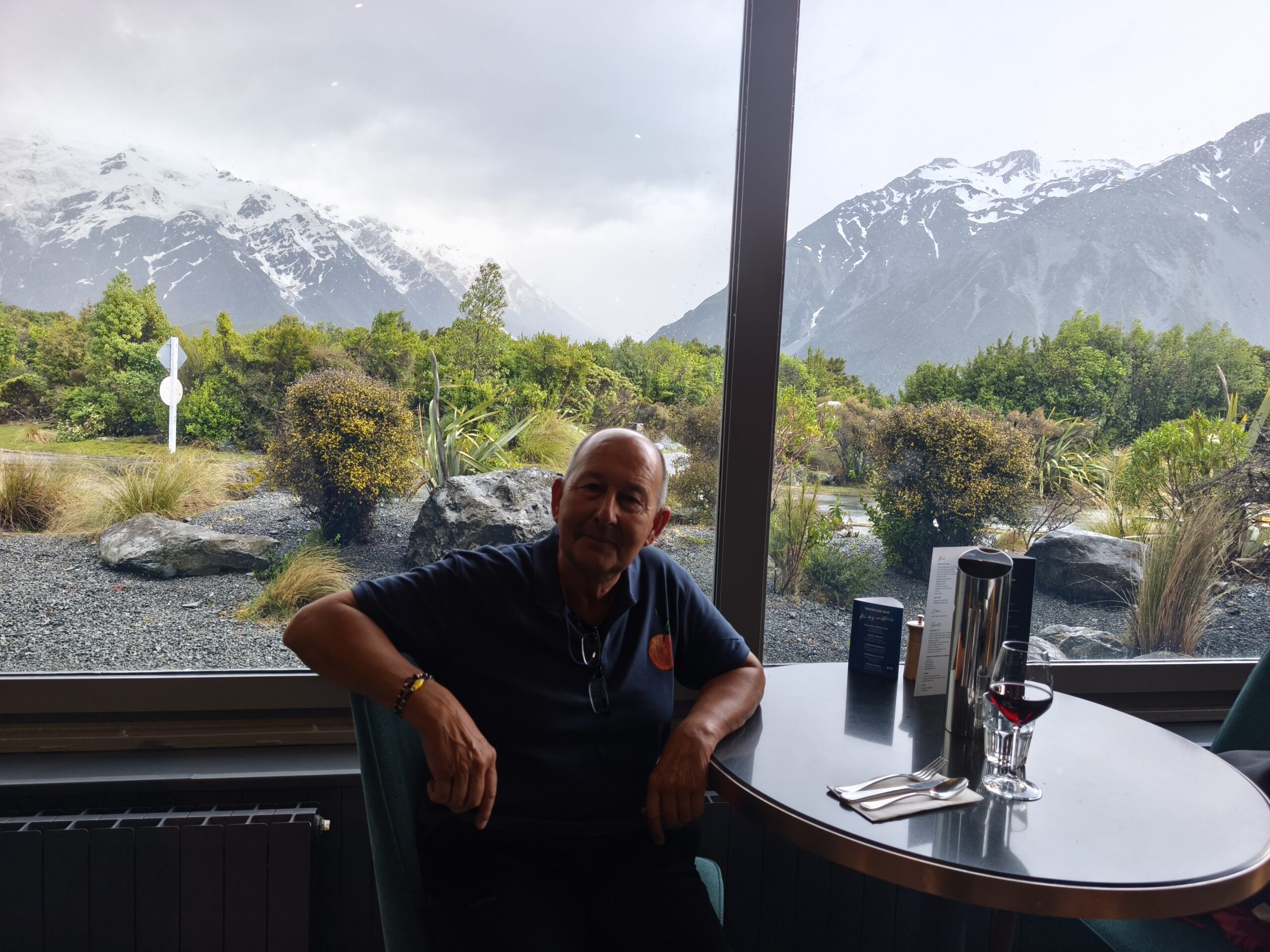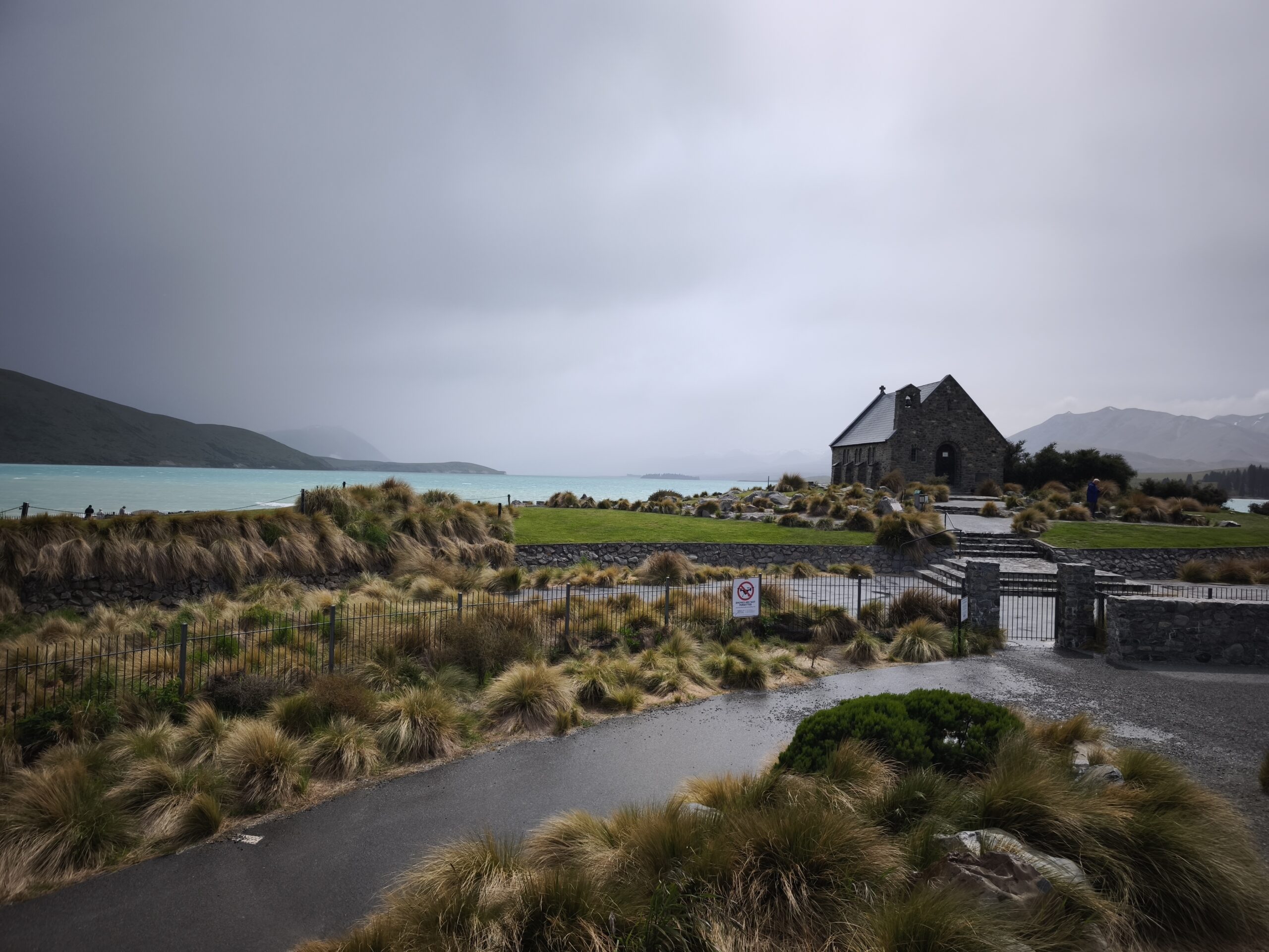 Amanece un día frío y ventoso. Hoy llegaré a Mount Cook. Después de desayunar salgo con la decisión de llegar primero a Lake Tekapo, porque hay aviso de lluvia y día cubierto en toda la zona, lo que limitará el poder parar en los miradores al macizo de los Alpes Neozelandases. A 20km está la base de Lake Pukaki. Ya el día está imposible, con mucha lluvia y viento; el lago está muy revuelto. Así que, para aprovechar el día, voy en sentido contrario, hacia Lake Tekapo. La SH8 tiene mucho tráfico, pero en una hora llego al lago. Ya hay mucha gente en los bares y tiendas al lado de la carretera. Me acerco a The Church of the Good Shepherd, sitio muy fotogénico y con mucha gente. Las fotos son testigo del día gris y fantasmagórico que llevo. A pesar de ello no tengo prisa, como allí antes de desandar el camino y llegar a Cook Village. Tarde de lluvia y cena en The Hermitage, al lado de la cristalera, para ver de cerca Los Alpes Neozelandeses y celebrar este viaje.