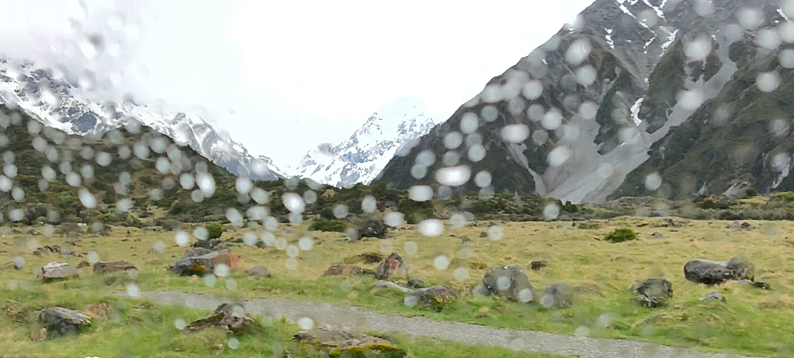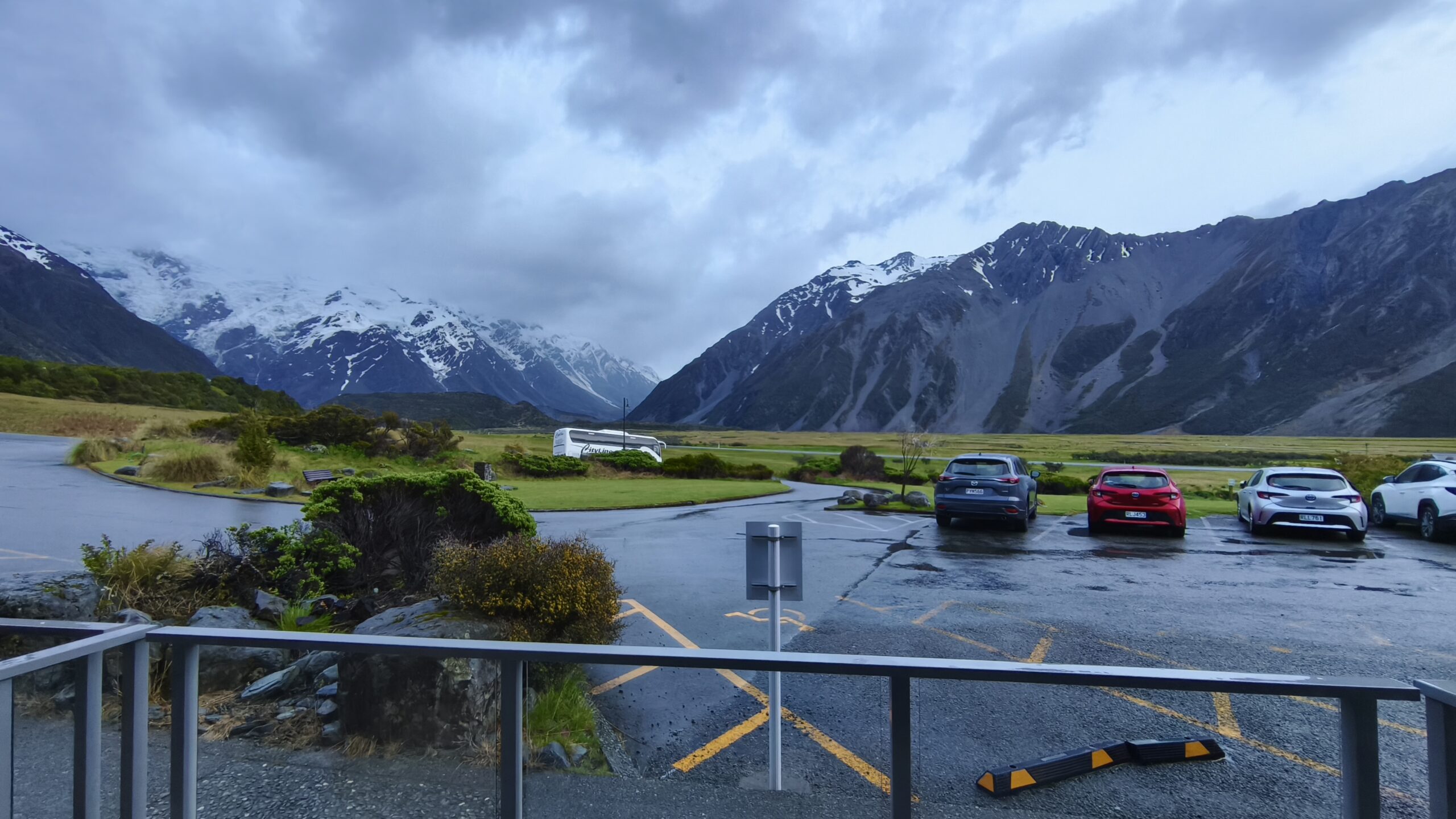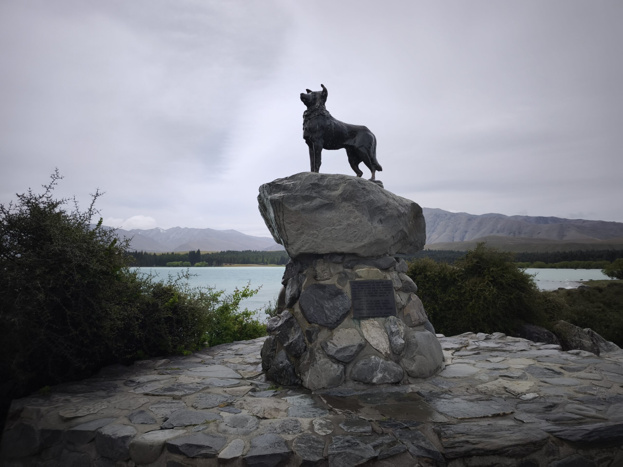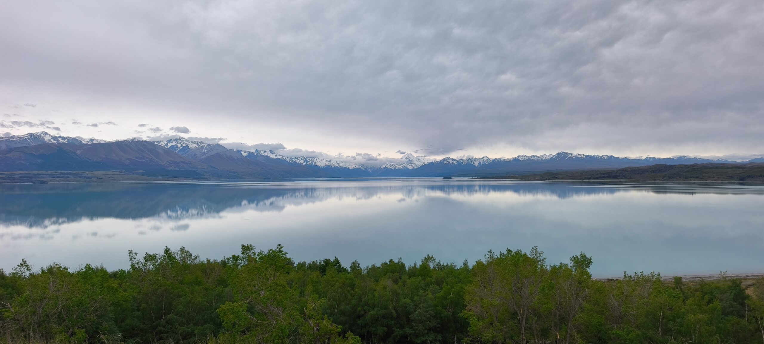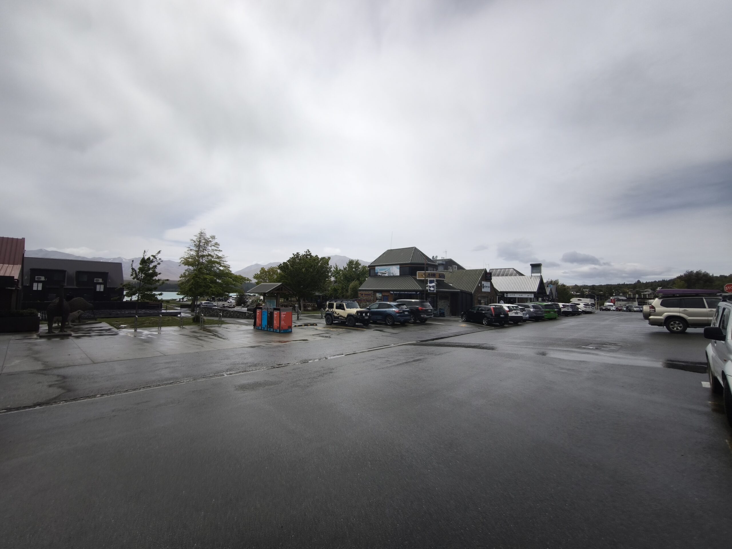 Amanece un día frío y ventoso. Hoy llegaré a Mount Cook. Después de desayunar salgo con la decisión de llegar primero a Lake Tekapo, porque hay aviso de lluvia y día cubierto en toda la zona, lo que limitará el poder parar en los miradores al macizo de los Alpes Neozelandases. A 20km está la base de Lake Pukaki. Ya el día está imposible, con mucha lluvia y viento; el lago está muy revuelto. Así que, para aprovechar el día, voy en sentido contrario, hacia Lake Tekapo. La SH8 tiene mucho tráfico, pero en una hora llego al lago. Ya hay mucha gente en los bares y tiendas al lado de la carretera. Me acerco a The Church of the Good Shepherd, sitio muy fotogénico y con mucha gente. Las fotos son testigo del día gris y fantasmagórico que llevo. A pesar de ello no tengo prisa, como allí antes de desandar el camino y llegar a Cook Village. Tarde de lluvia y cena en The Hermitage, al lado de la cristalera, para ver de cerca Los Alpes Neozelandeses y celebrar este viaje.
