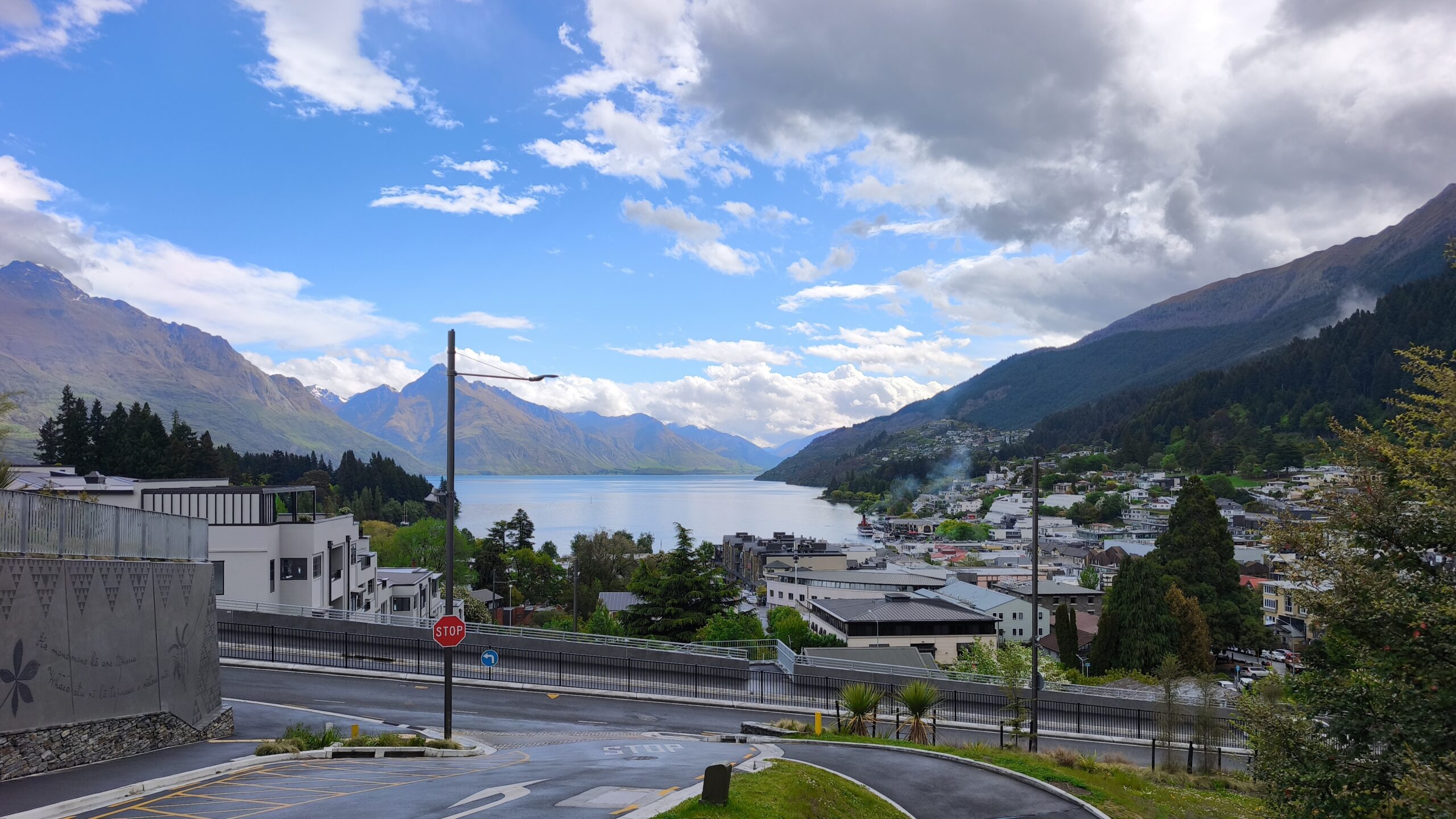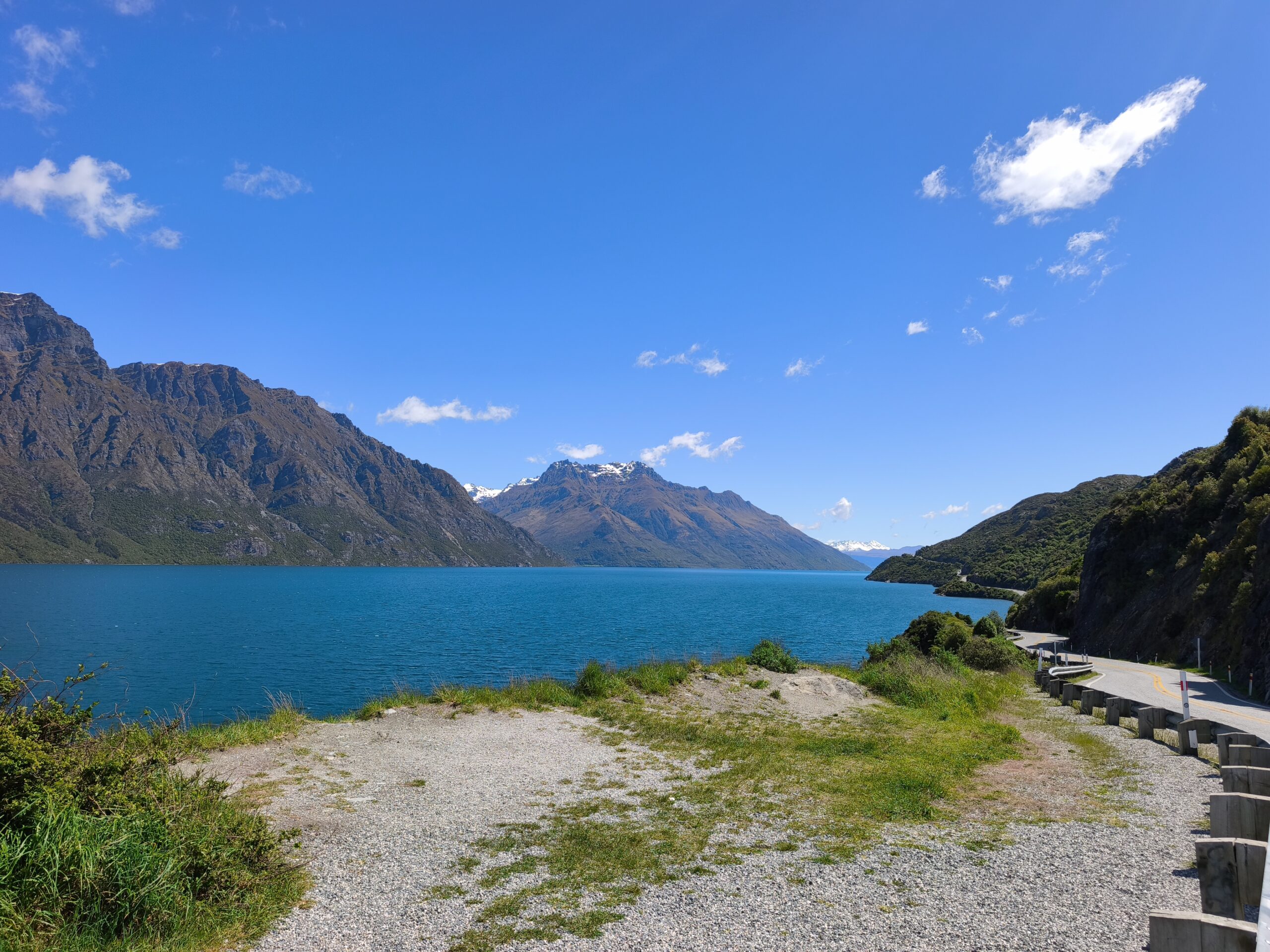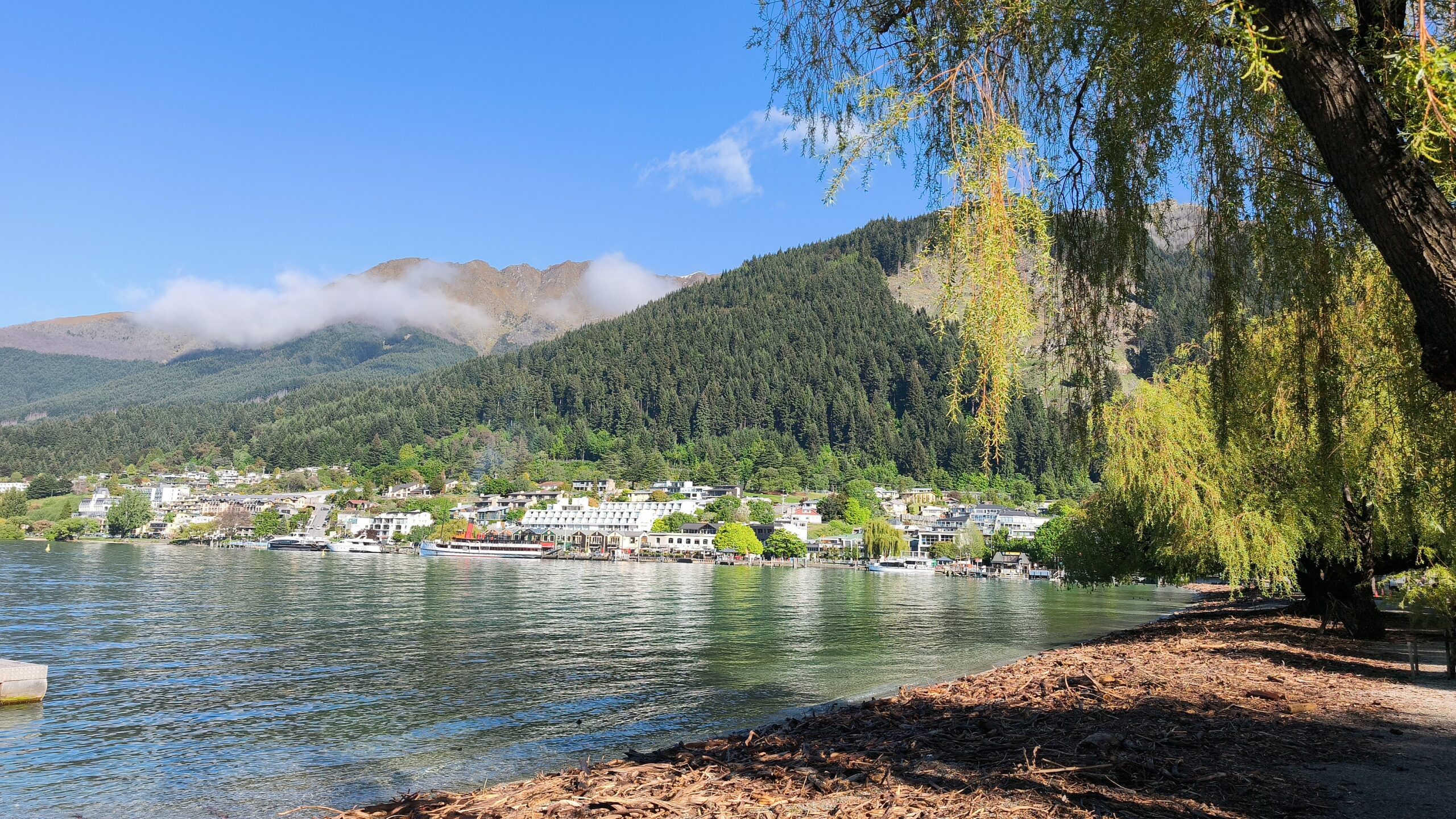 Llovió mucho la tarde-noche pasada, pero amaneció un día soleado que rápidamente calentó el frío de la mañana. Bajo a los jardines de la ciudad, tienen un parking que está muy cerca del centro, al que se llega paseando por la ribera del lago Wakatipu. Así que es un buen rato para volver a pasear por la calle principal y el borde del agua. Los barcos ya están saliendo para los turistas. Yo prefiero tomarme un café contemplando ese ir y venir. Son más de las 10 y media cuando regreso al coche. Voy a Te Anau, un recorrido primero al lado del brazo este del lago Wakatipu, para adentrarme luego en el amplio valle del río Mataura, verde, muy verde, me recuerda a la Isla Norte, con mucho ganado a ambos lados de la carretera. Quedan unos 70 kms cuando dejo la SH6 para coger la 94, que me lleva a Te Anau por el valle del río Oreti. La cara este de los Alpes Neozelandeses se ven cada vez más cerca. Tras el check-in voy a la localidad, a pasearla un rato antes de cenar. Mañana toca, de nuevo, madrugar