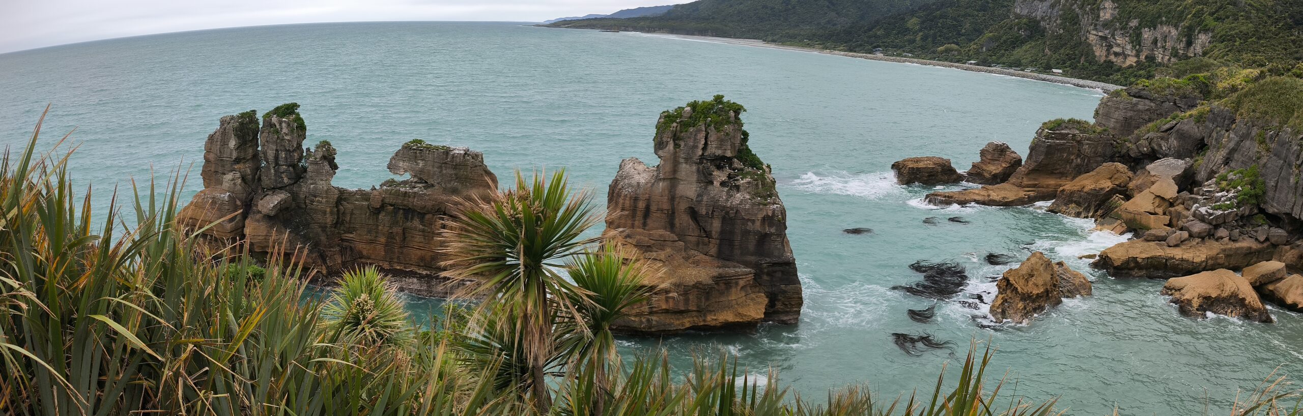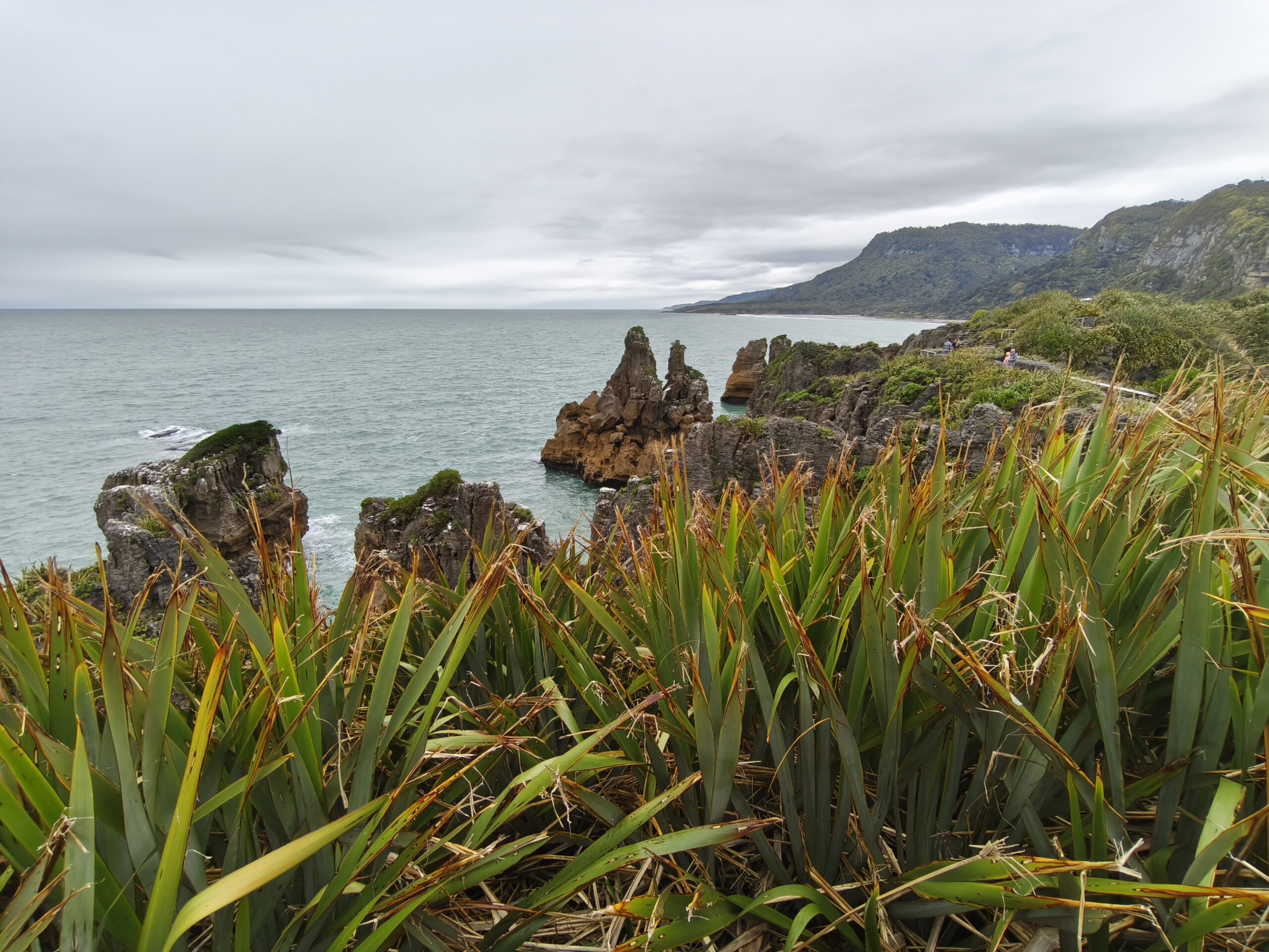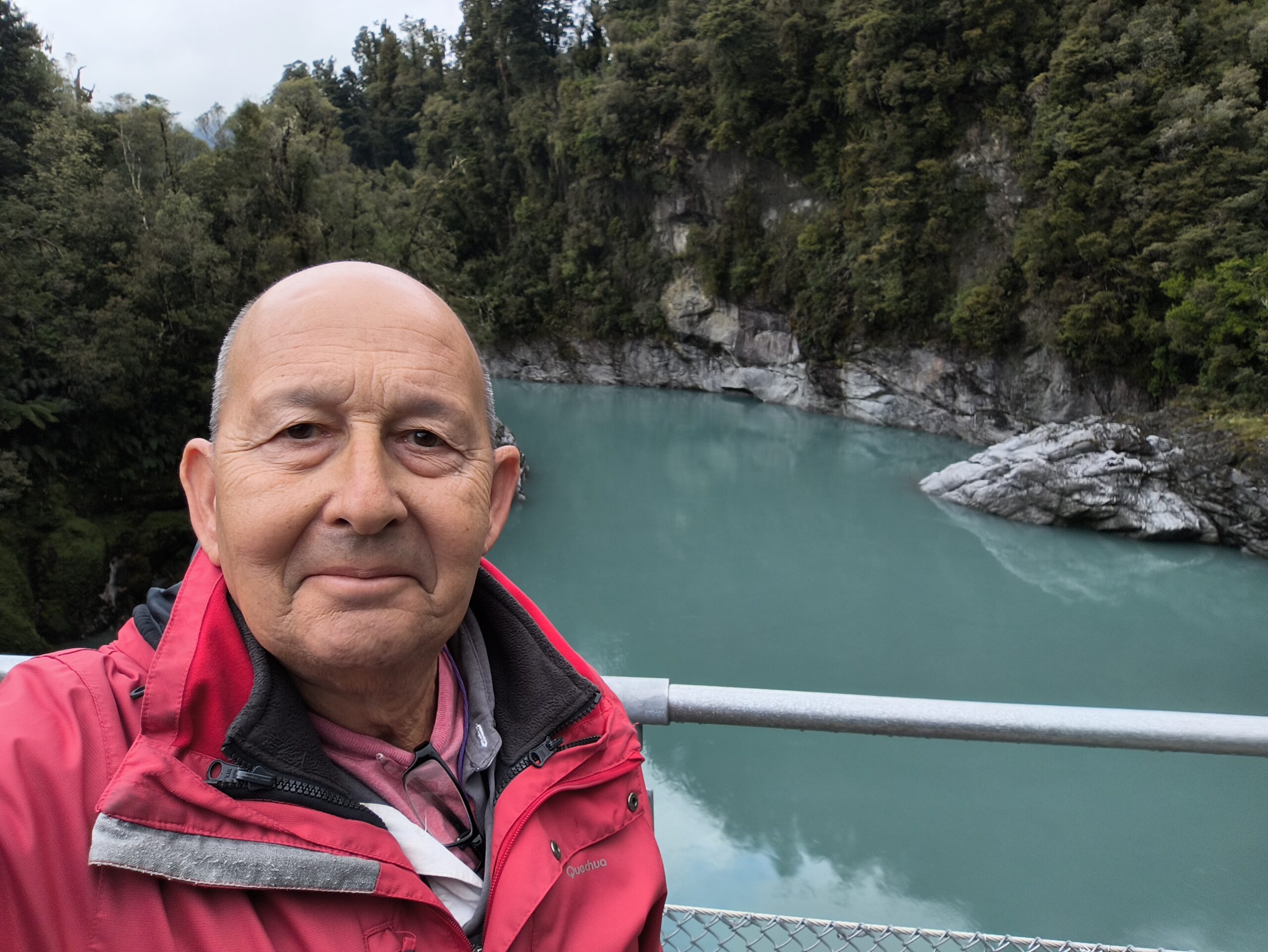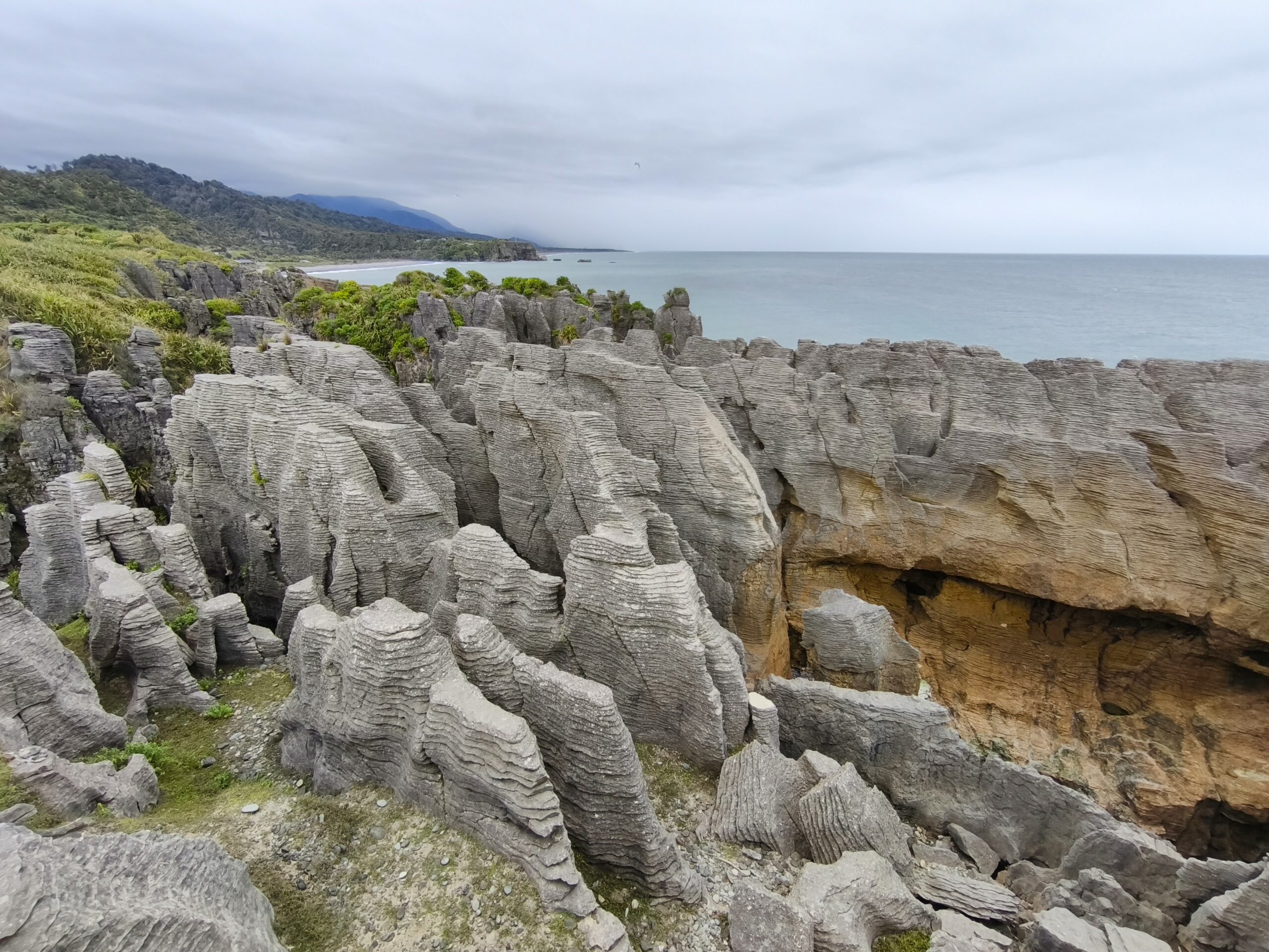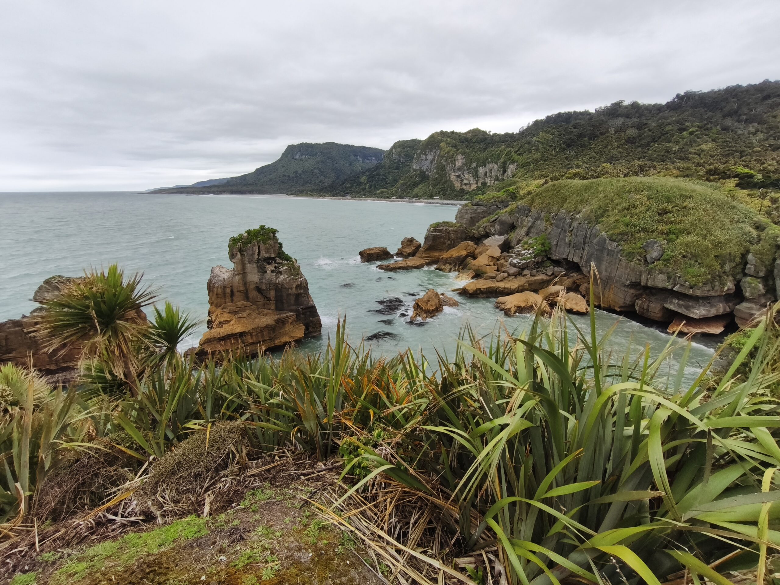 Desayuné bien y tras despedirme de los amables dueños y anfitriones salgo hacia el sur por la State Highway 6 (Great Coast Road). El día está cubierto y se espera lluvia. La parada de la mañana es en Pankace Rocks, un paisaje de piedra caliza con formaciones rocosas en forma de placas superpuestas, con agujeros que hacen de chimenea con marea alta, a los que se llega tras un corto paseo. Tomo café y empieza a llover continuadamente hasta llegar a Hokitika. Voy a comer algo y hacer tiempo. Tras hacer el chech-in en unas cabañas de madera, donde hoy me quedo, hago tiempo para ver si mejora la tarde. A las 6 salgo a Hokitika Gorge, aguas de un turquesa brillante bordeadas de acantilados de piedra caliza blanca y una exuberante selva tropical, a media hora de camino hacia el interior, para verlo. Y a descansar, que voy sumando días sin parar. Hay talleres de artistas que trabajan el «pounamu», el hueso y el vidrio.