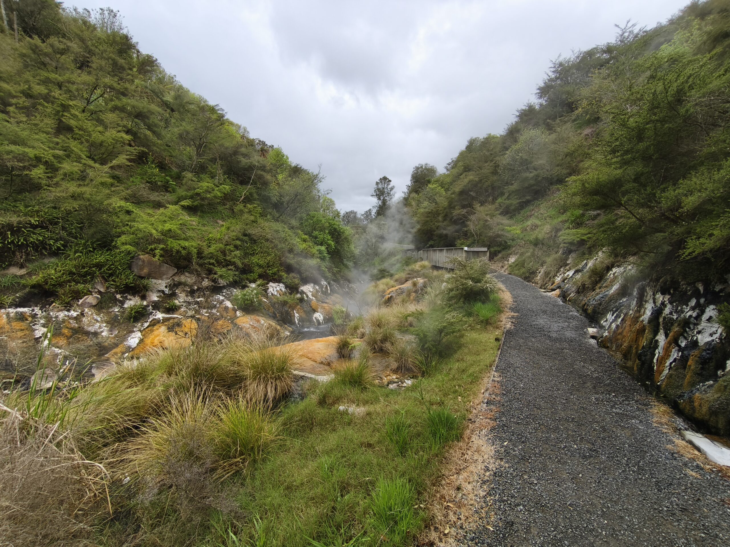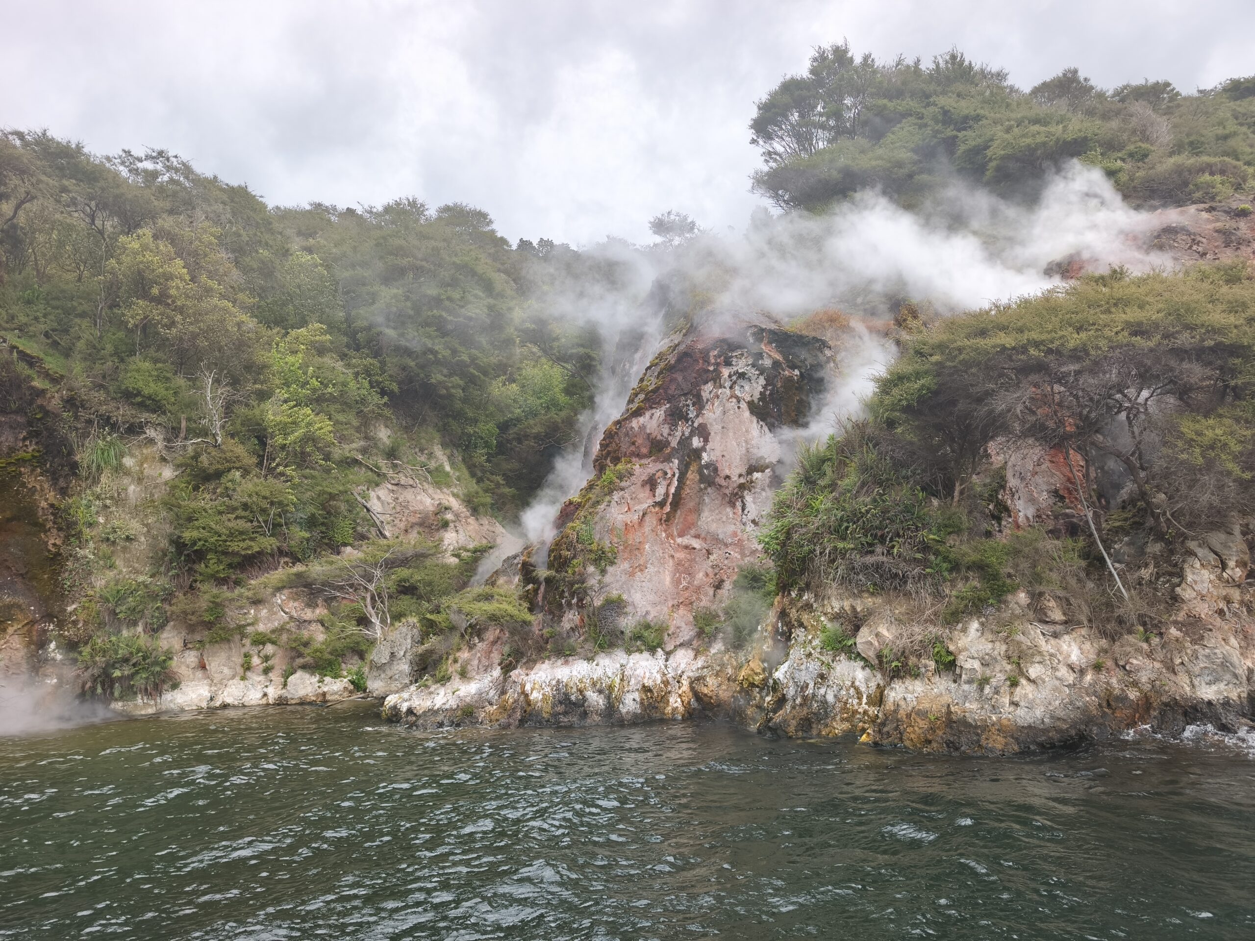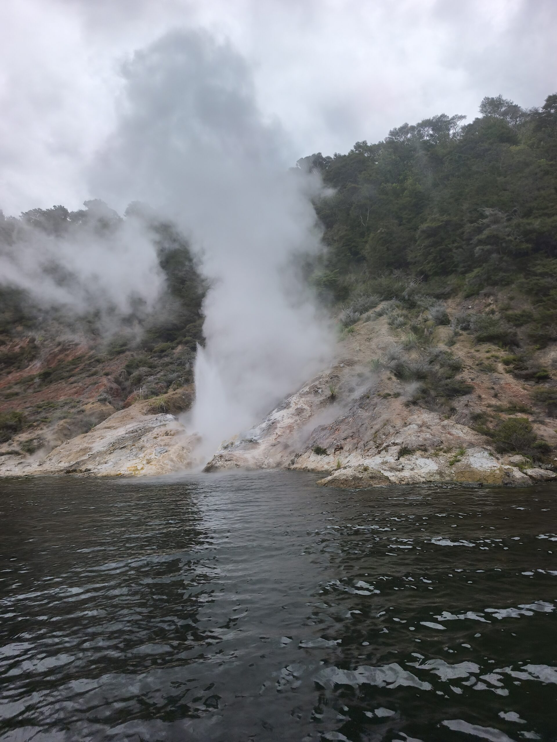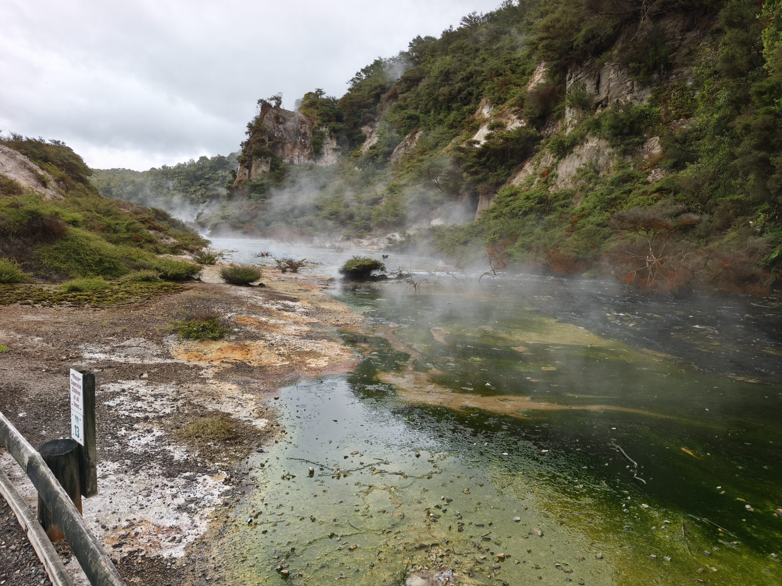 Hoy llevo en el programa ir a las dos áreas geotermales más llamativas. En media hora se llega a Wai-O-Tapu Thermal Wonderland. A las 8 y media de la mañana abren y compro la entrada (NZ$ 47). Se hace un recorrido para ver los géiseres y fumarolas y para, a las 10:15 am, acercarme al geiser Lady Knox, al que se le activa deliberadamente con jabón vertido en su boca. A mi no me ha gustado, pero es lo que hay. Continuo a Waimangu Vulcan Valley. Valle estrecho con estanques termales, cráteres y fumarolas. Hay autobuses que te llevan a 3 lugares distintos. Casi todos recorremos a pie los 4 kms de sendero bien cuidado y fácil de seguir hasta llegar al lago donde hay la opción de recorrerlo en barco durante 1h (se paga aparte). El sitio es precioso, con un bosque frondoso y verde inolvidable recorrido por el río burbujeante y las piscinas humeantes. Se regresa con el bus a la entrada. Tiene un pero, es muuuy caro, NZ$ 180, casi 100€ al cambio actual. Toda la mañana ha estado cubierta y con algo de lluvia, que aumenta y cala a partir de ese momento. He tenido suerte y he podido visitar ambos lugares.