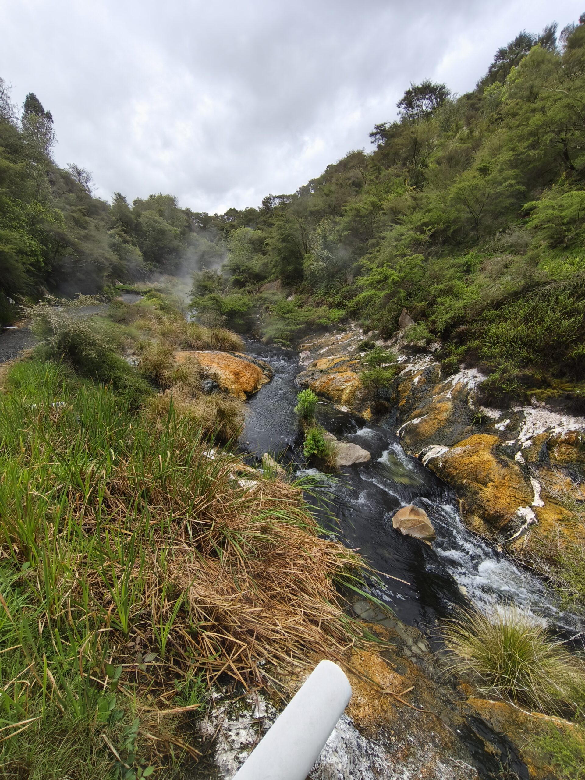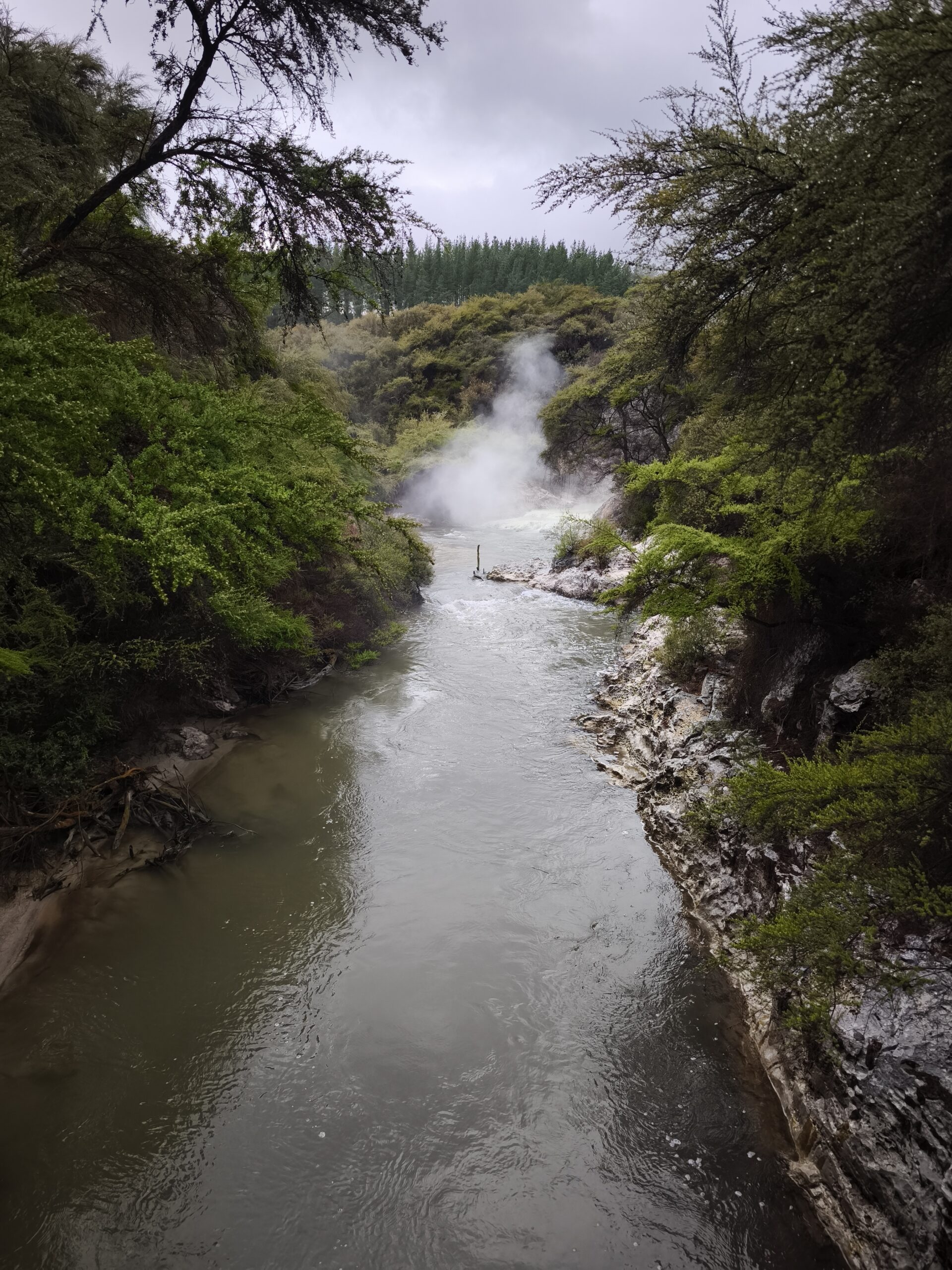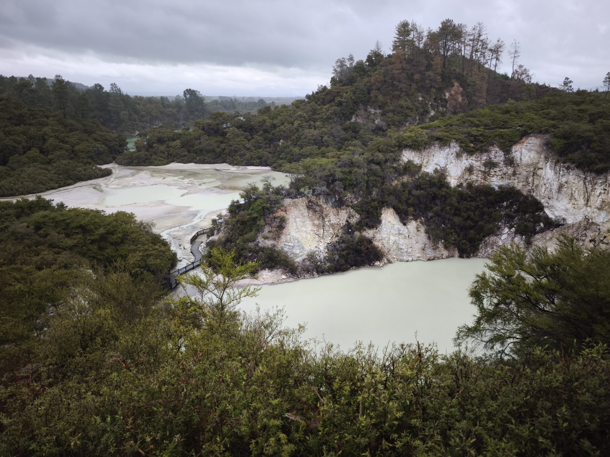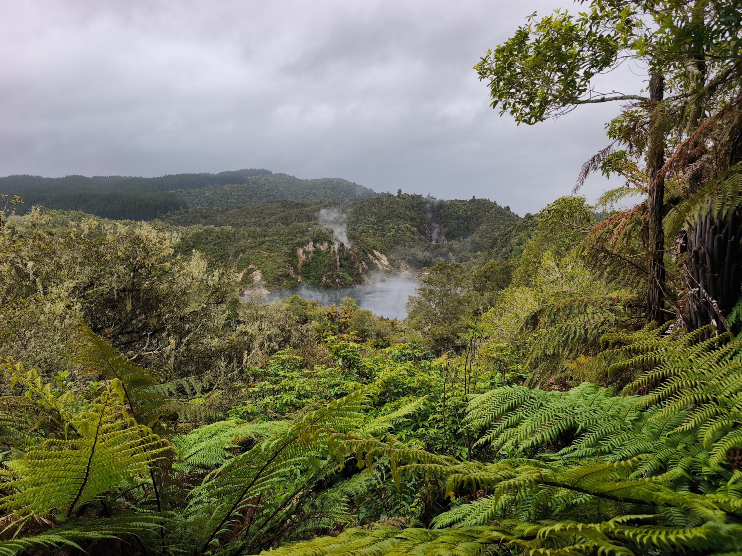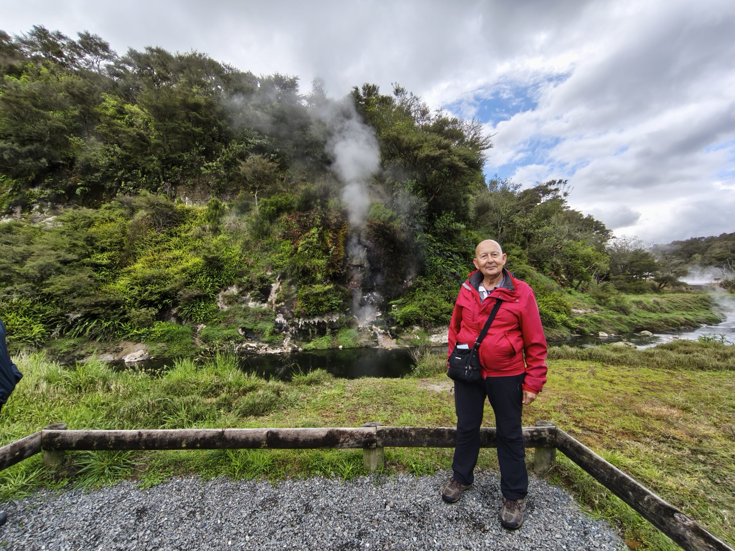 Hoy llevo en el programa ir a las dos áreas geotermales más llamativas. En media hora se llega a Wai-O-Tapu Thermal Wonderland. A las 8 y media de la mañana abren y compro la entrada (NZ$ 47). Se hace un recorrido para ver los géiseres y fumarolas y para, a las 10:15 am, acercarme al geiser Lady Knox, al que se le activa deliberadamente con jabón vertido en su boca. A mi no me ha gustado, pero es lo que hay. Continuo a Waimangu Vulcan Valley. Valle estrecho con estanques termales, cráteres y fumarolas. Hay autobuses que te llevan a 3 lugares distintos. Casi todos recorremos a pie los 4 kms de sendero bien cuidado y fácil de seguir hasta llegar al lago donde hay la opción de recorrerlo en barco durante 1h (se paga aparte). El sitio es precioso, con un bosque frondoso y verde inolvidable recorrido por el río burbujeante y las piscinas humeantes. Se regresa con el bus a la entrada. Tiene un pero, es muuuy caro, NZ$ 180, casi 100€ al cambio actual. Toda la mañana ha estado cubierta y con algo de lluvia, que aumenta y cala a partir de ese momento. He tenido suerte y he podido visitar ambos lugares.