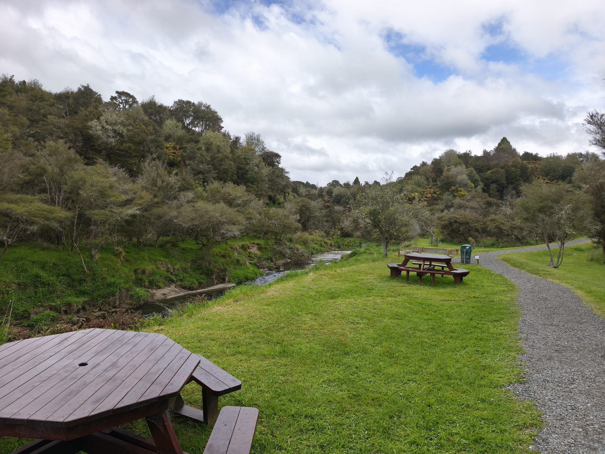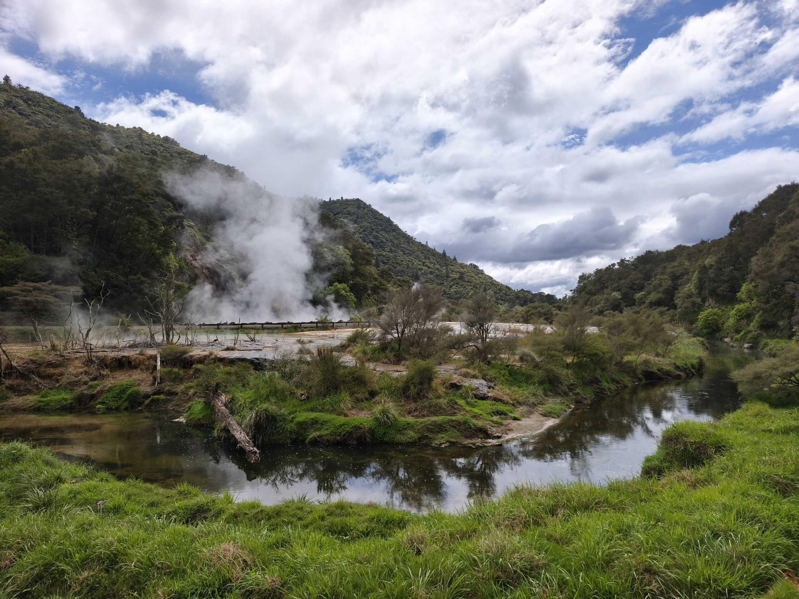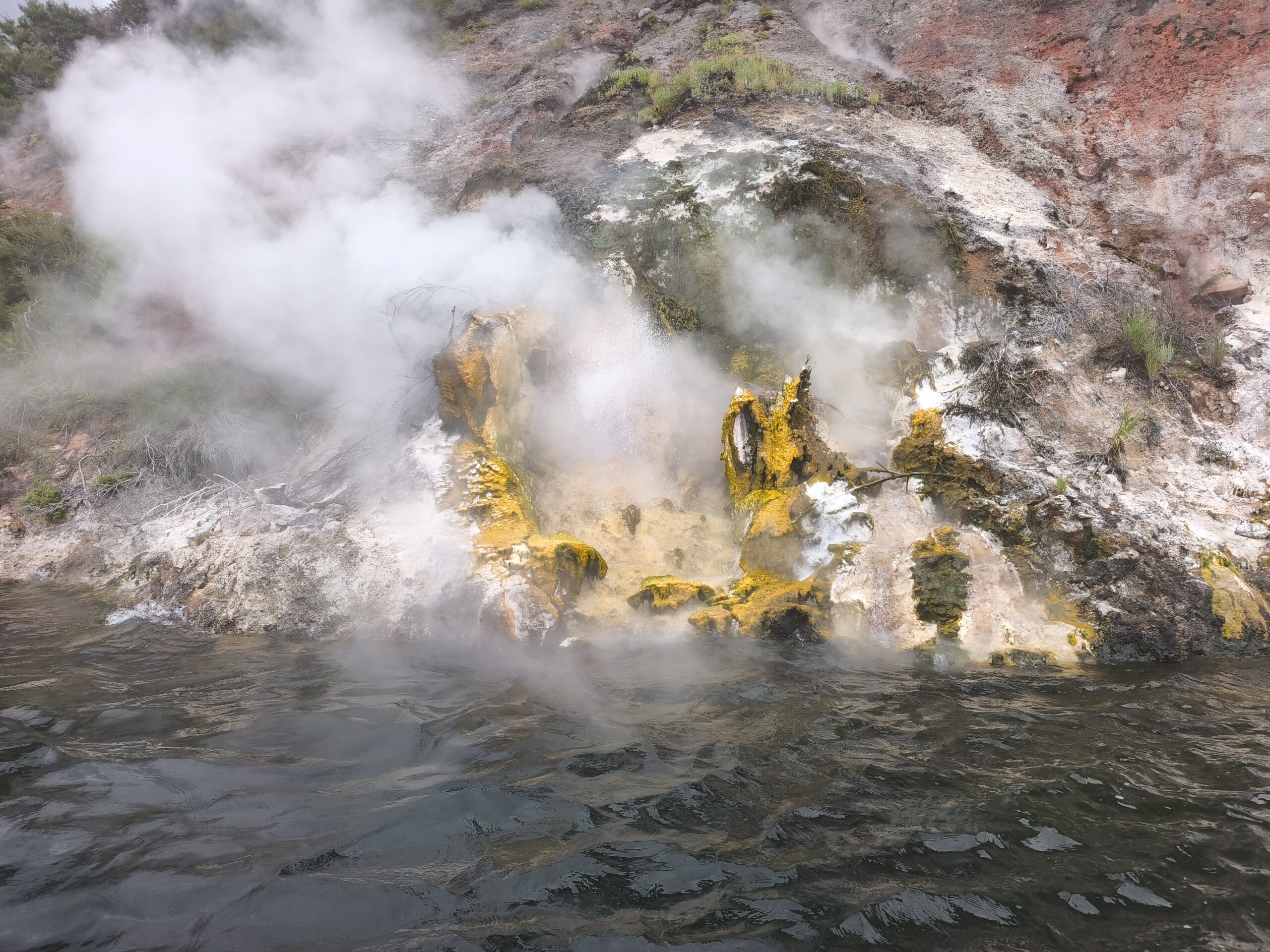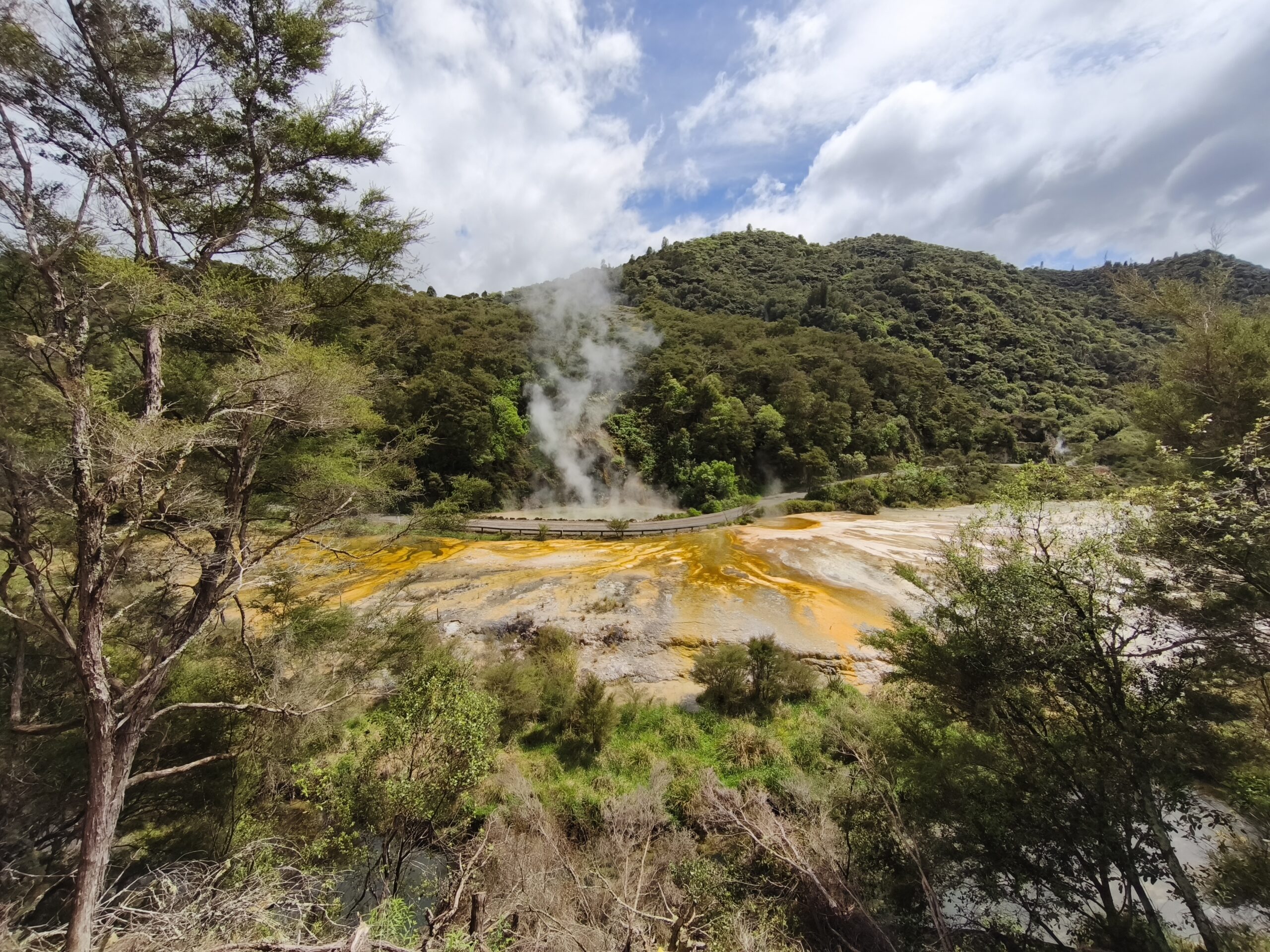 Hoy llevo en el programa ir a las dos áreas geotermales más llamativas. En media hora se llega a Wai-O-Tapu Thermal Wonderland. A las 8 y media de la mañana abren y compro la entrada (NZ$ 47). Se hace un recorrido para ver los géiseres y fumarolas y para, a las 10:15 am, acercarme al geiser Lady Knox, al que se le activa deliberadamente con jabón vertido en su boca. A mi no me ha gustado, pero es lo que hay. Continuo a Waimangu Vulcan Valley. Valle estrecho con estanques termales, cráteres y fumarolas. Hay autobuses que te llevan a 3 lugares distintos. Casi todos recorremos a pie los 4 kms de sendero bien cuidado y fácil de seguir hasta llegar al lago donde hay la opción de recorrerlo en barco durante 1h (se paga aparte). El sitio es precioso, con un bosque frondoso y verde inolvidable recorrido por el río burbujeante y las piscinas humeantes. Se regresa con el bus a la entrada. Tiene un pero, es muuuy caro, NZ$ 180, casi 100€ al cambio actual. Toda la mañana ha estado cubierta y con algo de lluvia, que aumenta y cala a partir de ese momento. He tenido suerte y he podido visitar ambos lugares.
