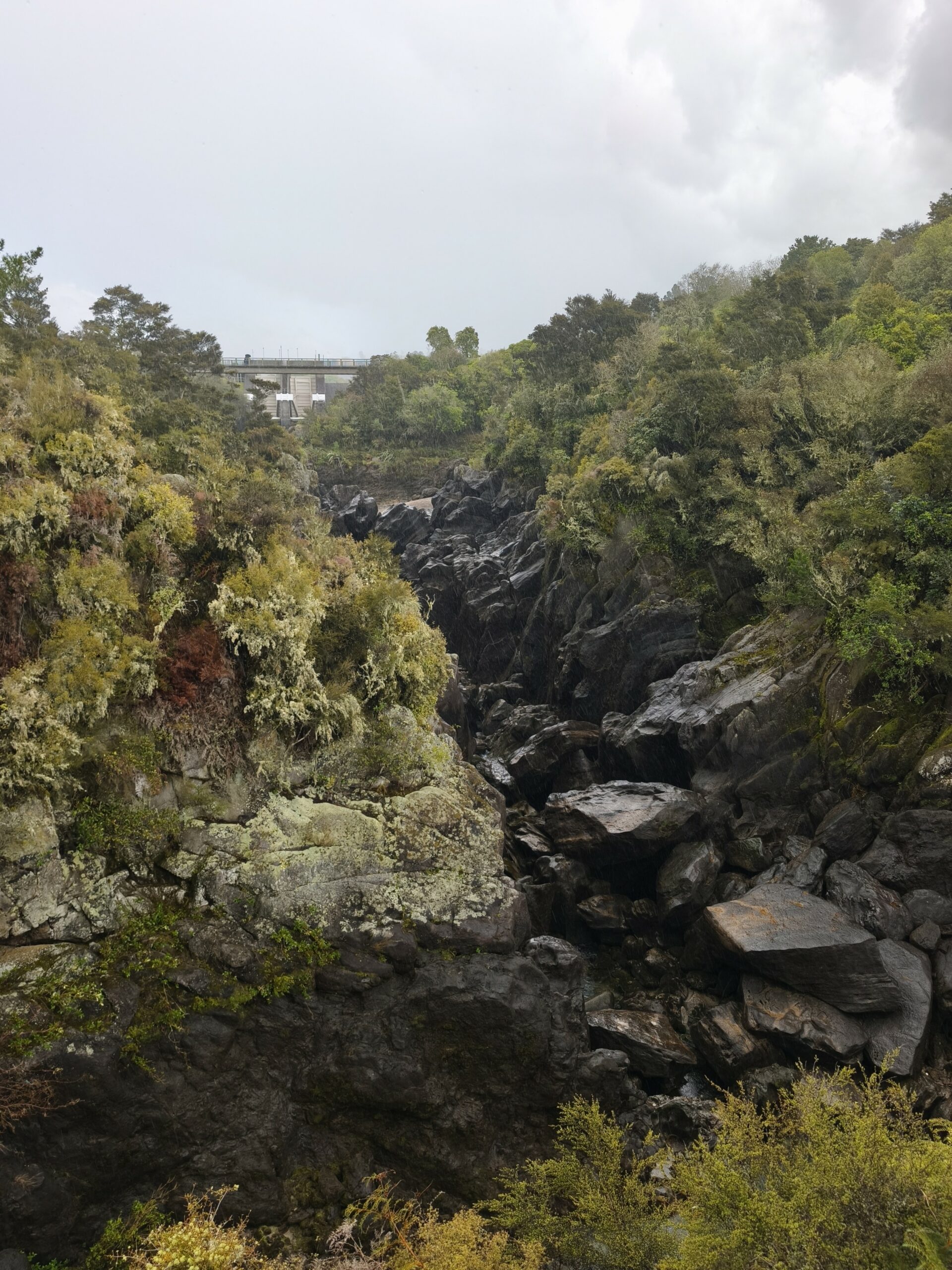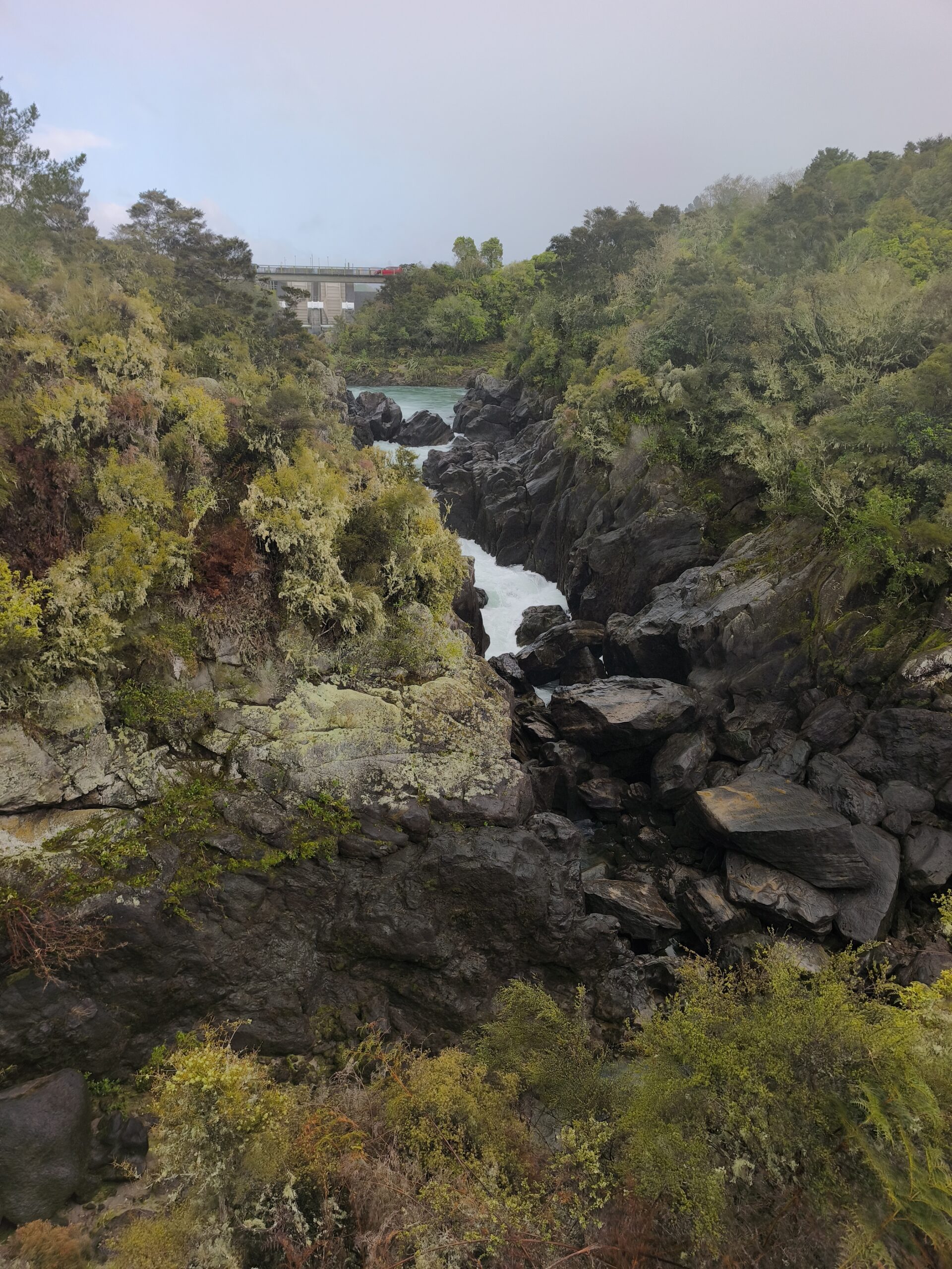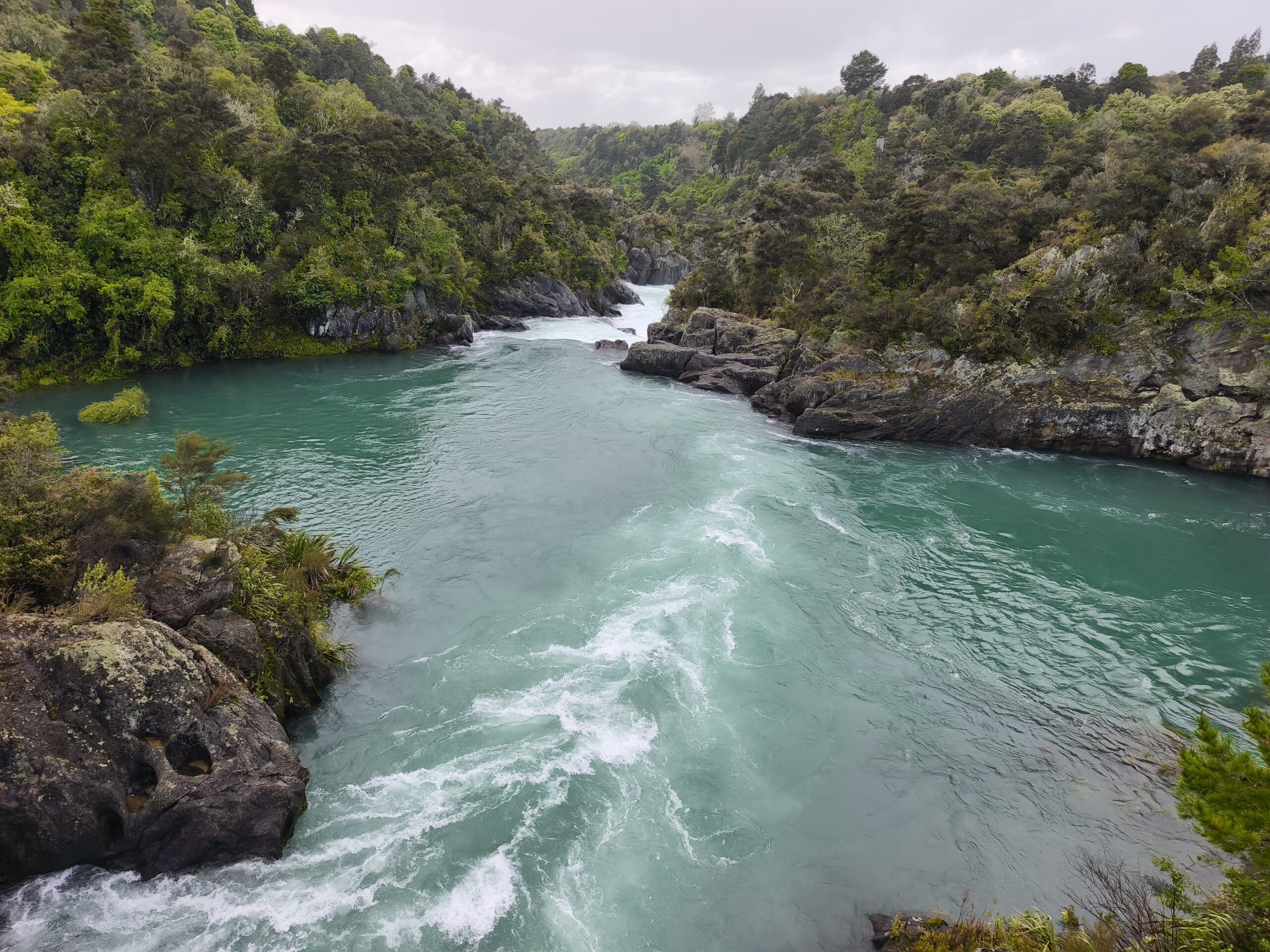 Se presenta un día lluvioso, más hacia la zona donde voy. Antes de las 10 am ya estoy en AratiatiaRapids. La presa y los rápidos de Aratiatia se encuentran en el río Waikato (el más largo de NZ), aguas abajo del lago Taupo, a unos 16 km del centro de la ciudad. La presa se abre tres veces al día en invierno y cuatro veces al día en verano. Hay varios miradores desde donde se puede observar cuan rápidamente se llena de agua el cauce del río. Continuo a Huka Falls, El río Waikato se estrecha drásticamente en las cataratas Huka, generando suficiente energía para llenar una piscina olímpica en solo 11 segundos. El efecto es hipnótico, pero ruidoso. Oirás las cataratas Huka antes de