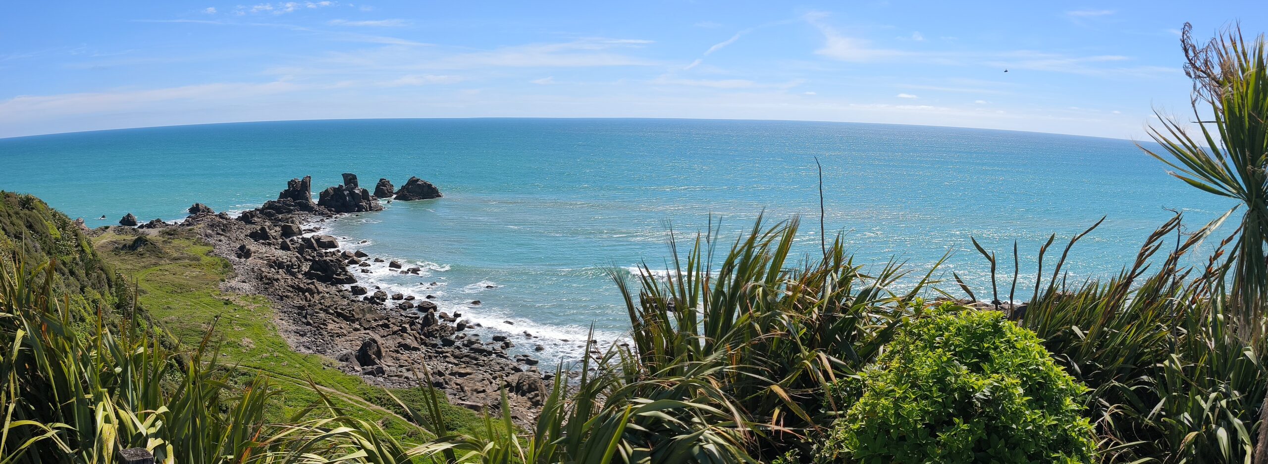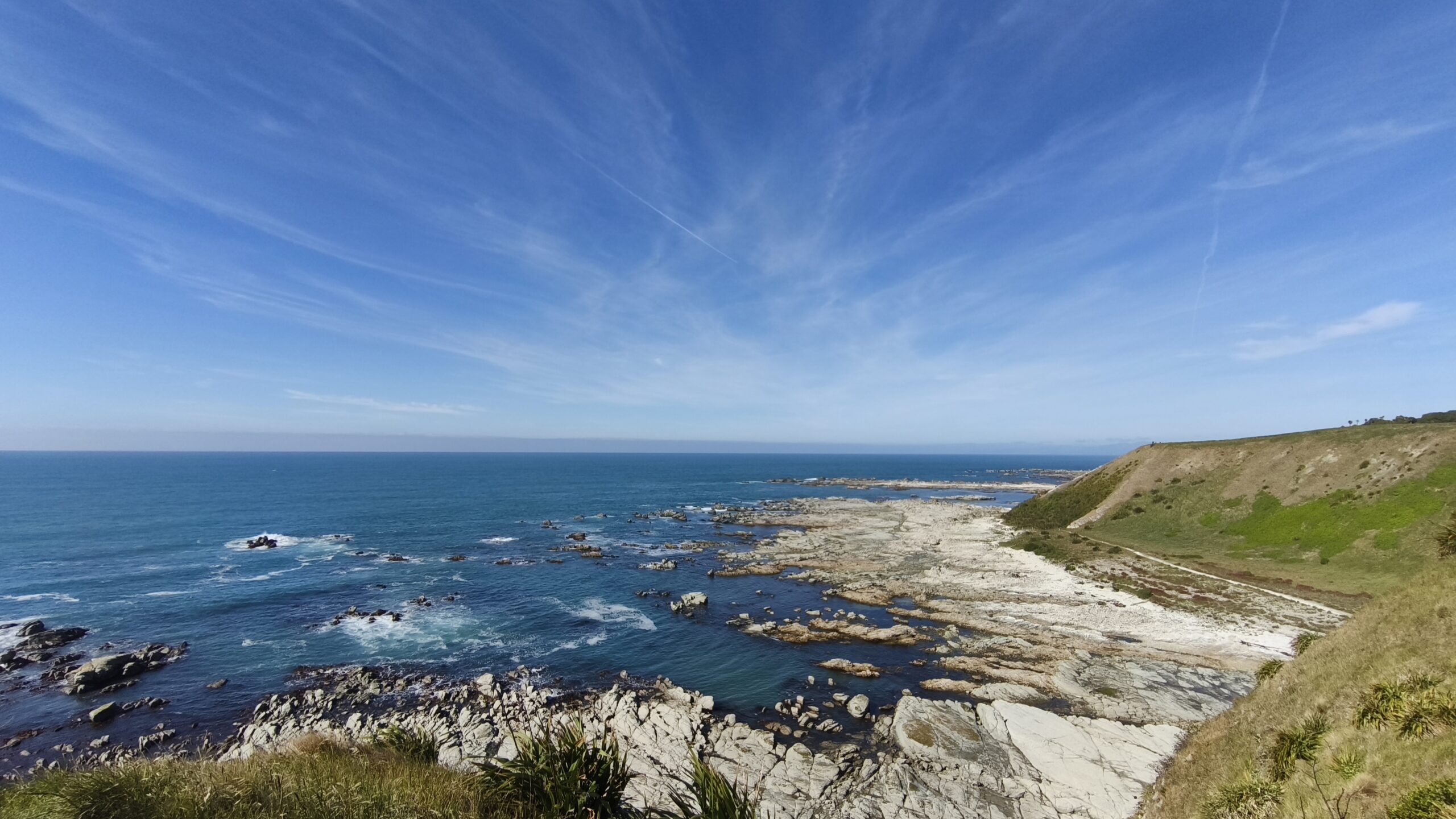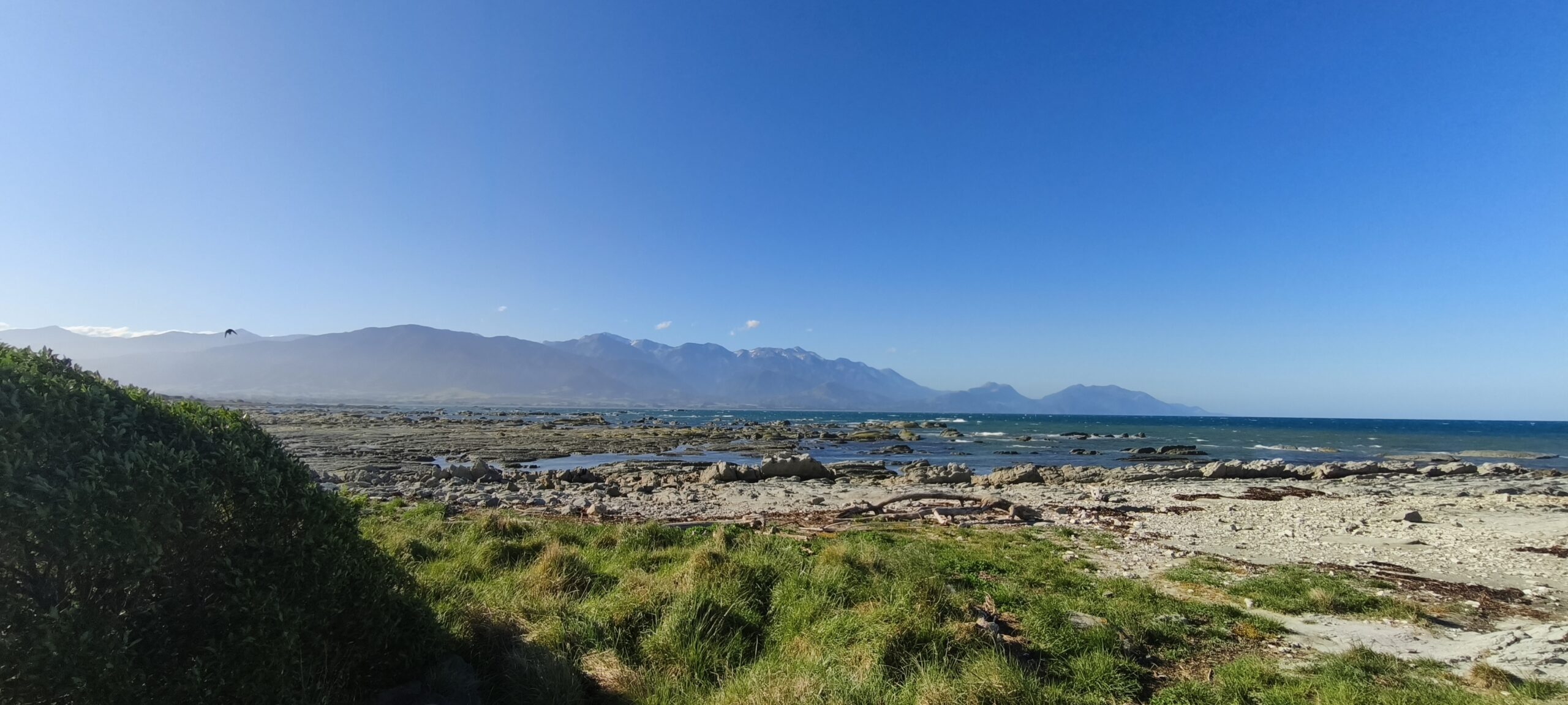 Después de desayunar me acerco a Point Kean, uno de los mejores lugares de la zona para ver focas, muy popular entre la población. Voy al Sendero Península de Kaikoura/Kaikoura Peninsula Walkway, 3.5 km, (1h ida) que lleva por los acantilados hasta South Bay, con unas vistas únicas del paisaje y colonias de lobos marinos, gaviotas e incluso, pardelas. Paro en los miradores del camino y bajo a las rocas para volver por el camino inferior, cerca de este hábitat. El día es estupendo y la gente acude (es domingo). Regreso al pueblo y tras tomar un café y descansar un rato subo al mirador de la localidad (Kaikoura Lookout), desde el que se ve toda la costa de norte a sur. Es la hora de comer, así que voy a Kaikoura Seafood BBQ, un kiosko cercano a Point Kean, a comer langosta. A la tarde doy un paseo por la playa. Casi no hay gente.