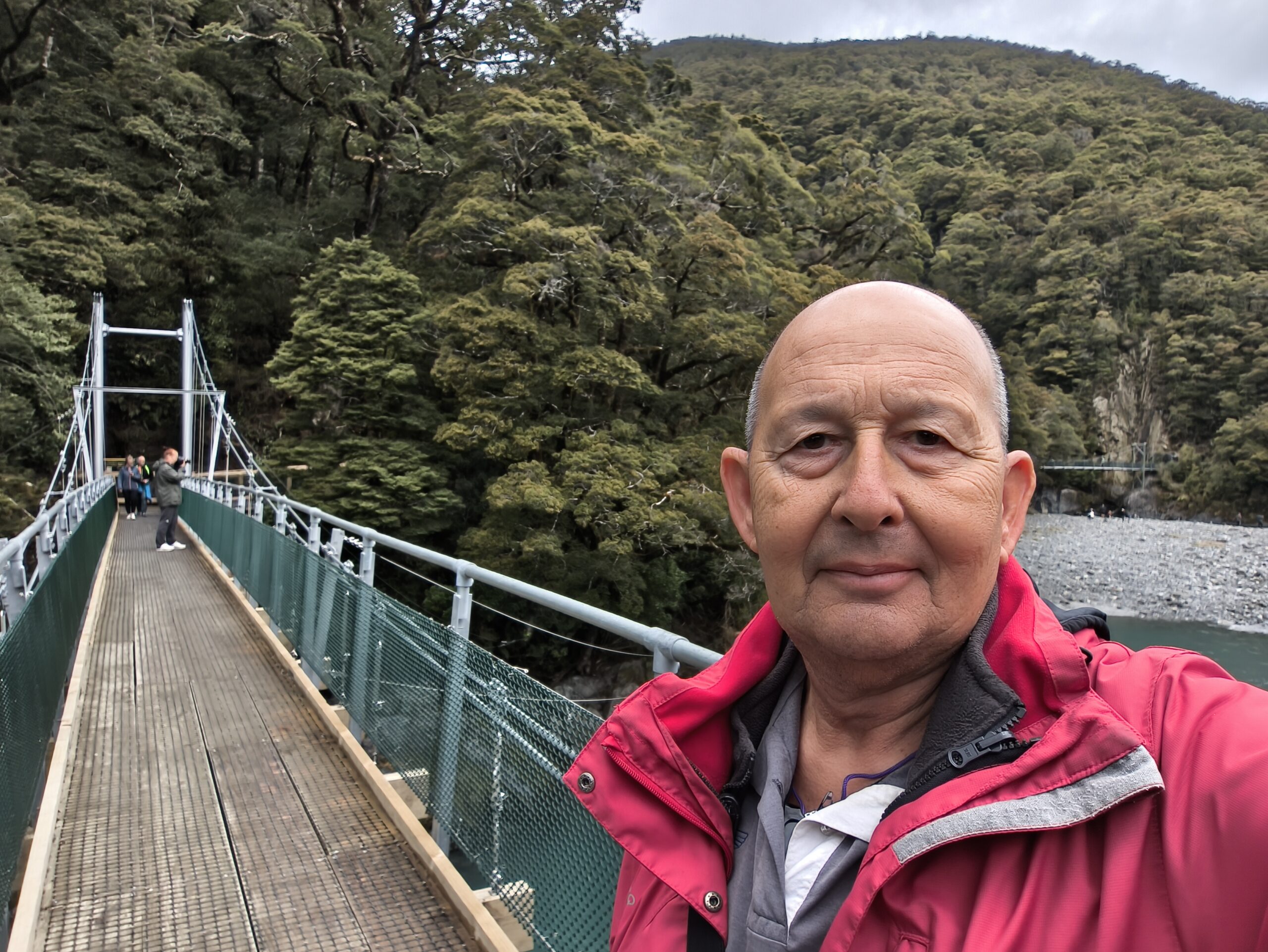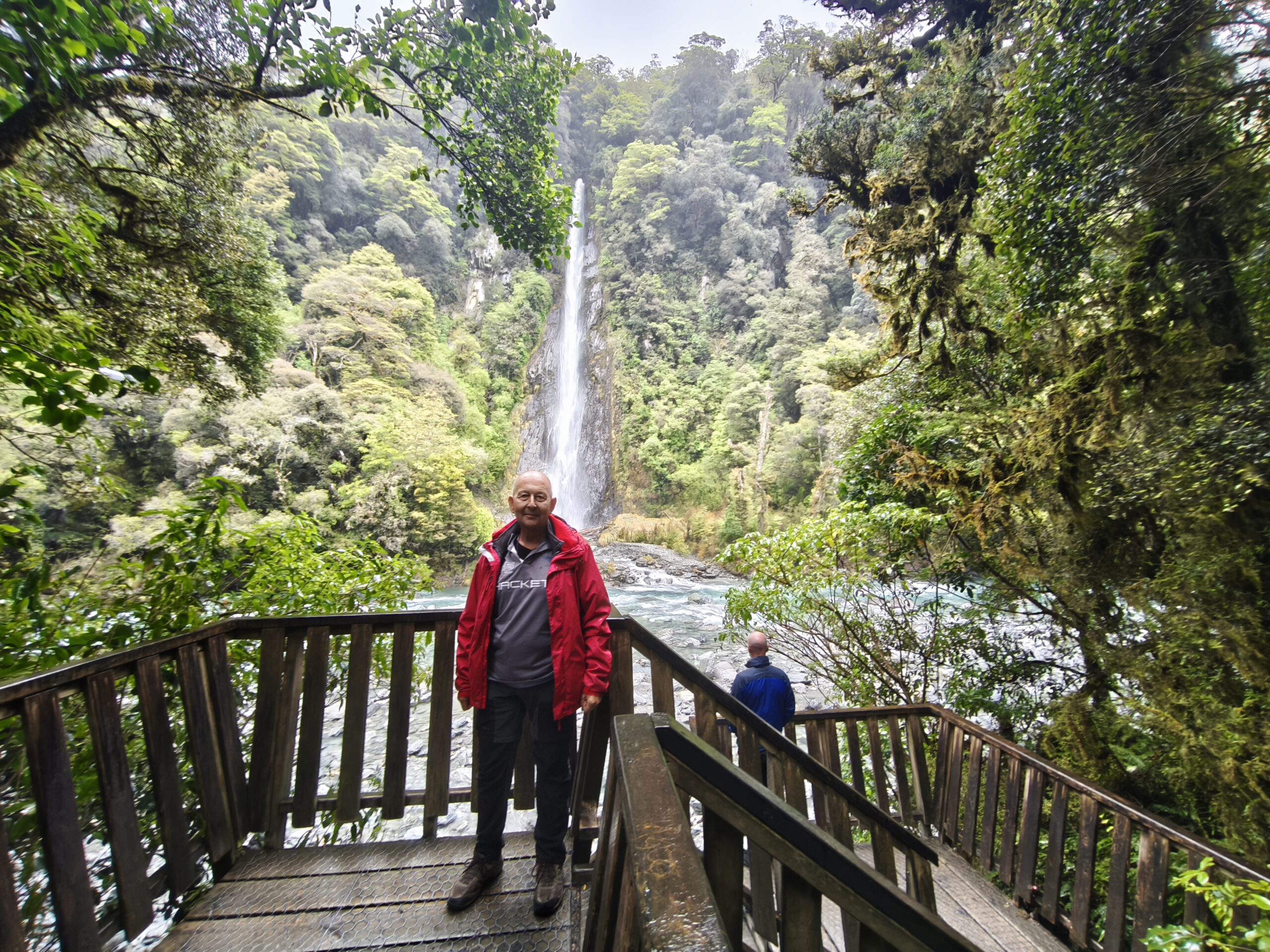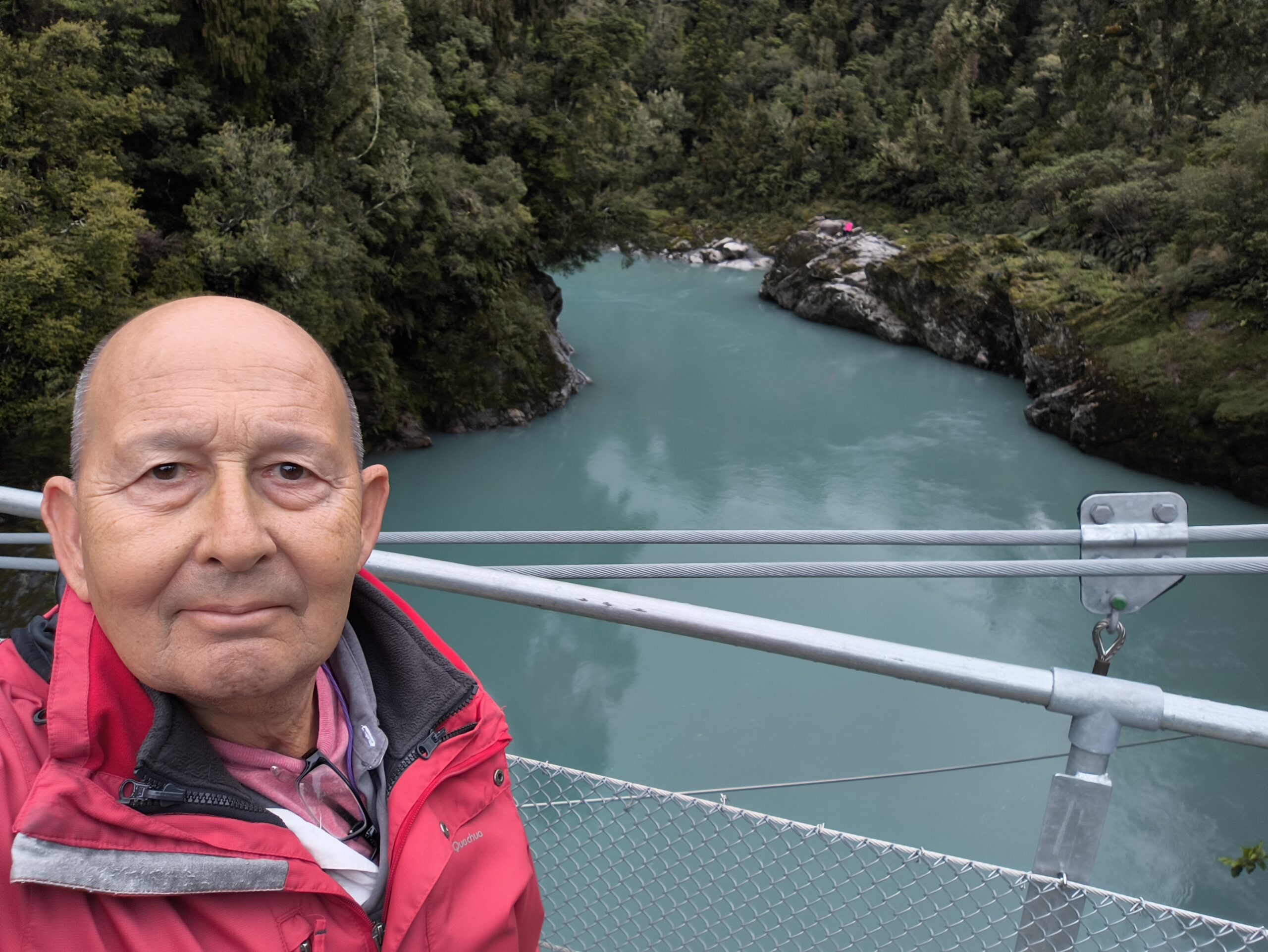 Tras desayunar salgo hacia el sur, de nuevo por la SH6. Un largo recorrido en el que cruzaré los Alpes Neozelandeses por Haast hasta llegar a Wanaka, ciudad muy animada a orillas del lago del mismo nombre. La carretera discurre por bosques interminables y costea unos kms hasta llegar a Haast, donde se vuelve a internar hacia el este. Y llueve. Ya llevo más de la mitad de camino cuando paro en Thunder Creek Falls, con una caída de 28m hasta el río Haast. Cerca está Fantail Falls, de menor caída que la anterior, pero también paro a verlo. Continúo a Blue Pools Track, 3km, 1h (i/v), hay pozas azules, caminando por un bosque de hayas y podocardos. Se cruza un puente colgante y móvil. Hay otro puente después. Los últimos 70 kms se van abriendo a los valles y lagos Wanaka y Hawea.