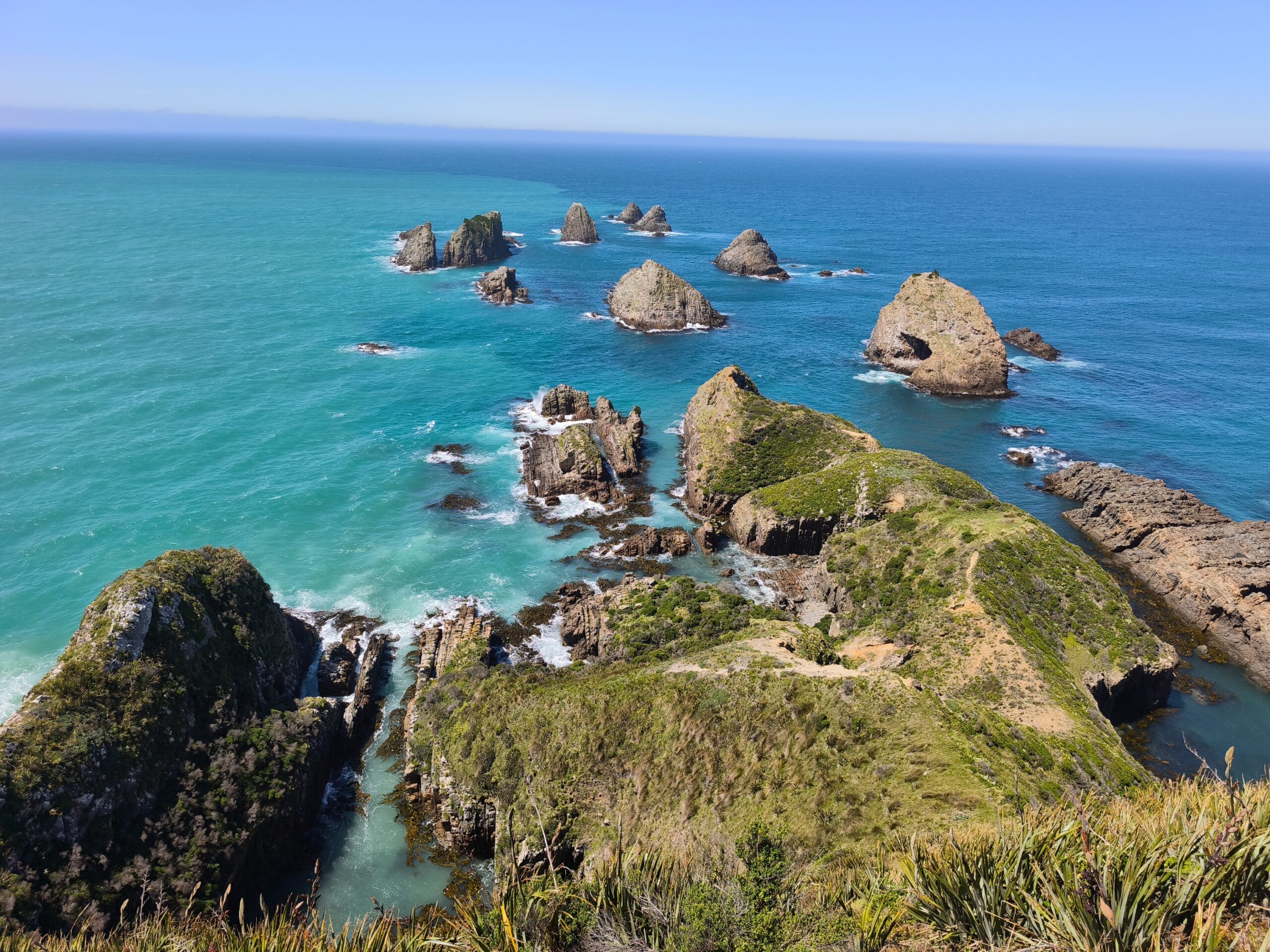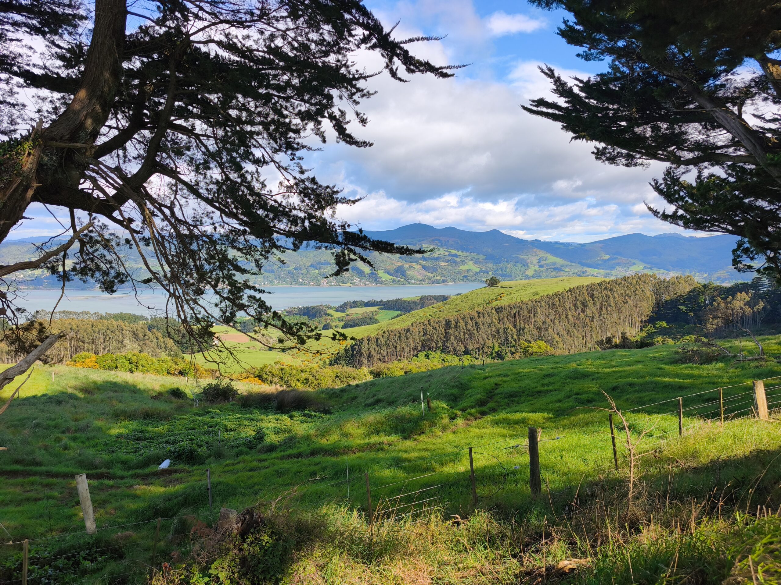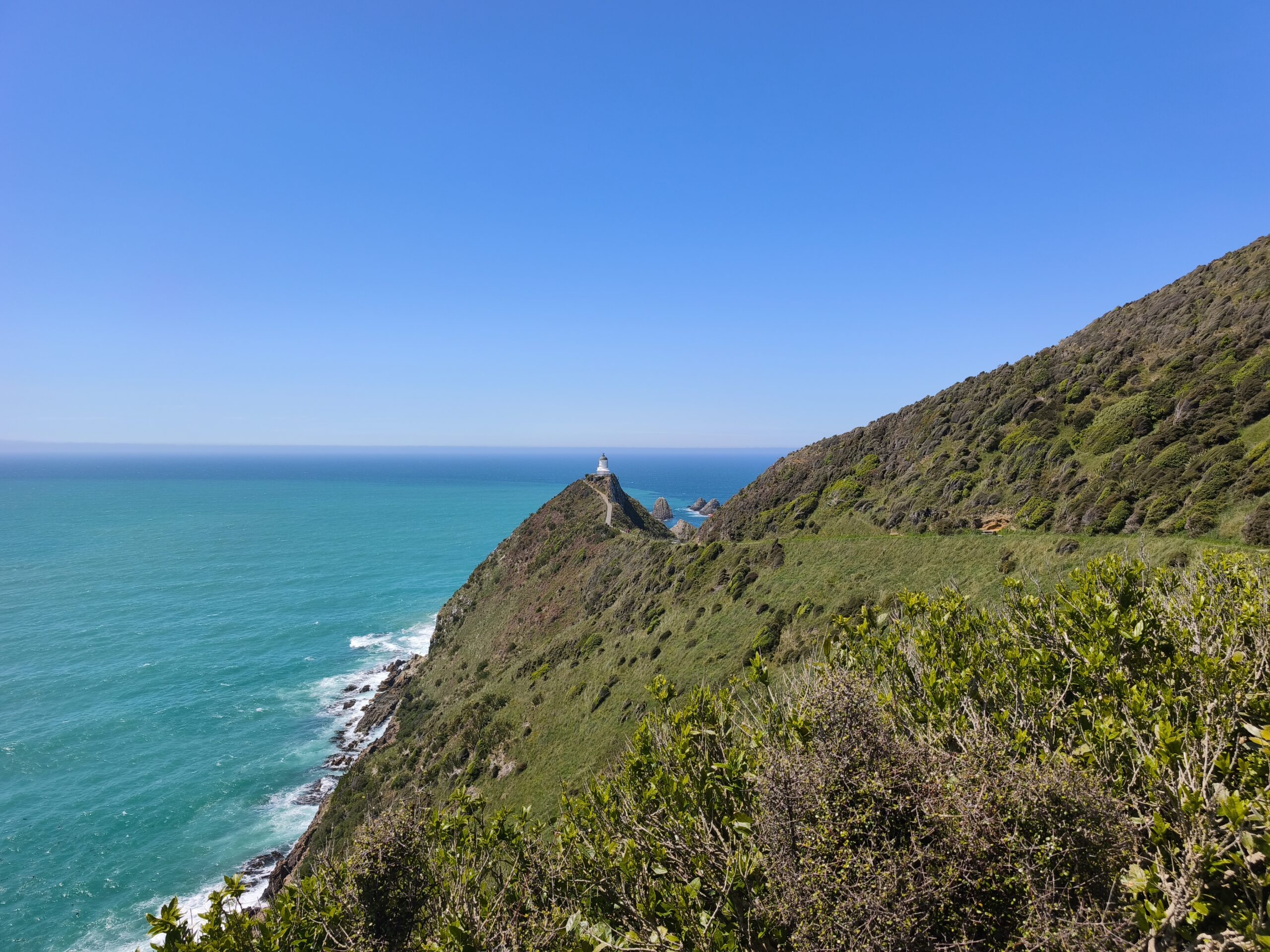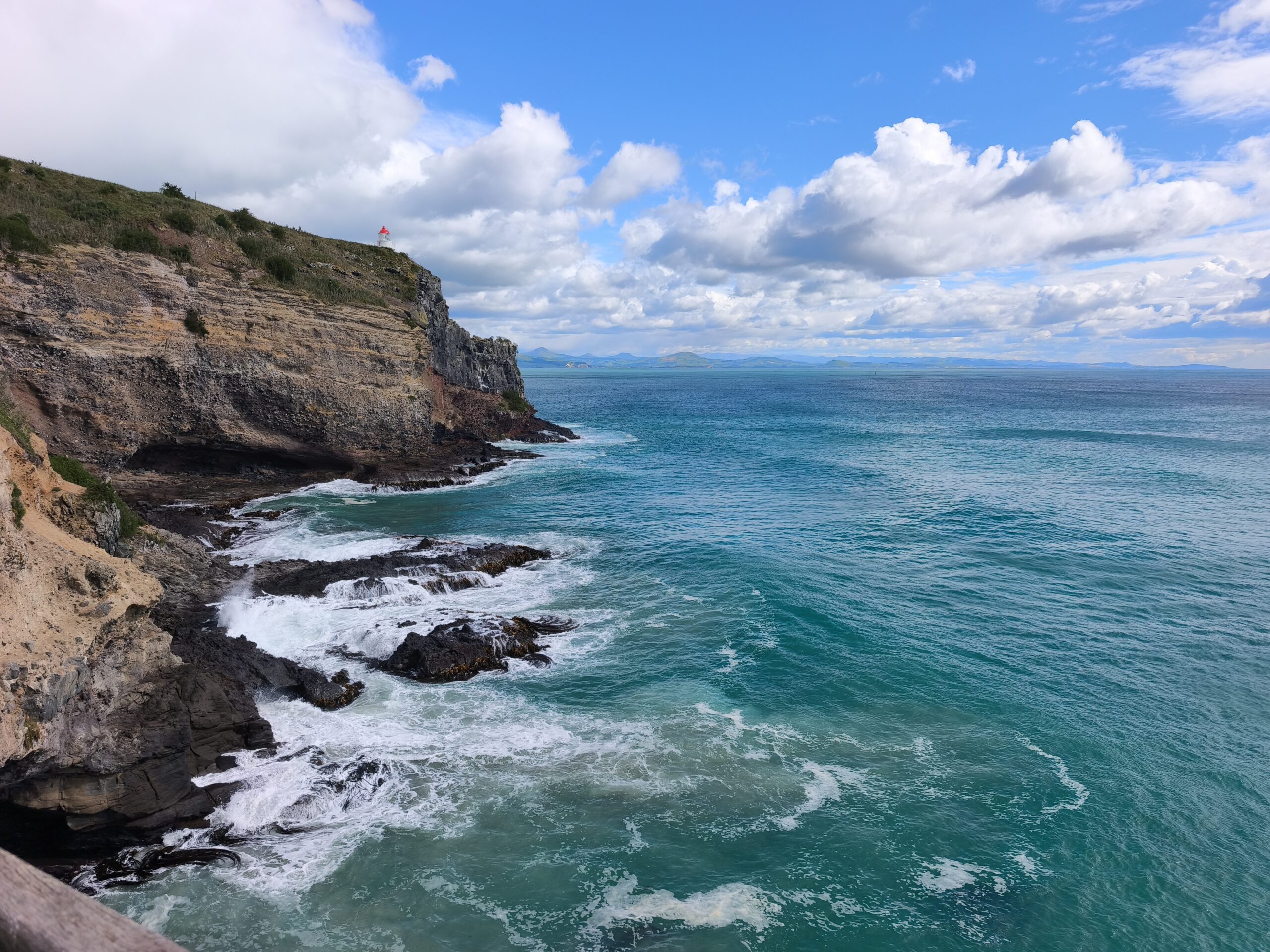 Ver amanecer en Waikawa harbour es un relajante privilegio. Primero me acerco de nuevo a ver Curio Bay desde arriba, se divisa Purpose Bay y la playa con una mañana soleada pero ventosa. Vuelvo a la carretera para seguir atravesando Los Catlins, ahora por Catlins forest, más de 20 km entre bosques, sin otro horizonte. Cathedral Caves está cerrado, así que continúo hacía el este. Paro en Florence Hill Lookout, con vistas a Oyster bay y Tauruku bay, con un azul turquesa precioso. Paro en Purakaunui Falls, con un recorrido corto por un agradable sendero entre el bosque. La siguiente parada es el faro de Nugget Point, uno de los sitios más llamativos de Los Catlins y del día. Allí donde el viento azota el promontorio y las rocas son golpeadas por esas olas (nuggets). Paro a comer en Kaka Point antes de continuar el recorrido e incorporarme a la SH1, donde el ingente tráfico me devuelve a la civilización durante los últimos 80 km hasta llegar a Dunedin.